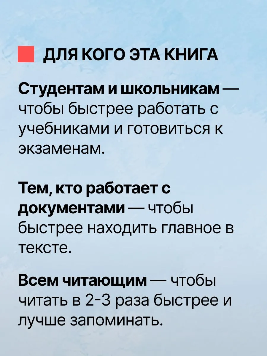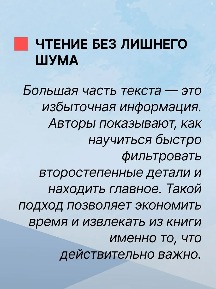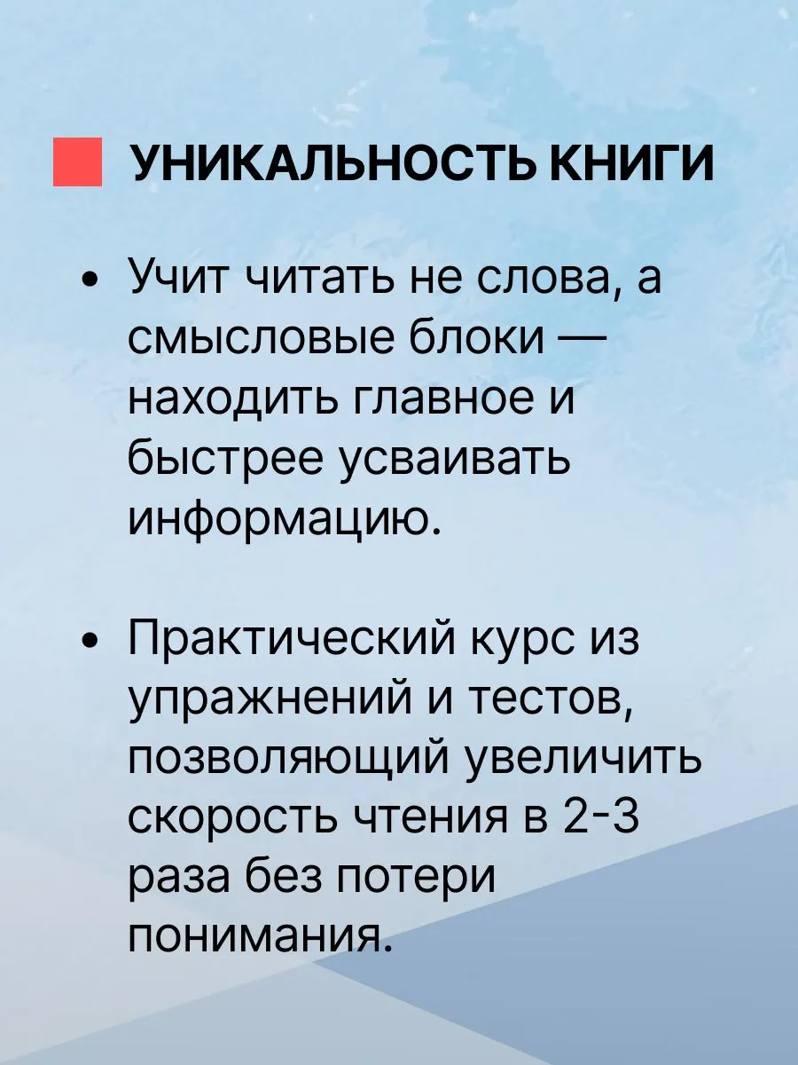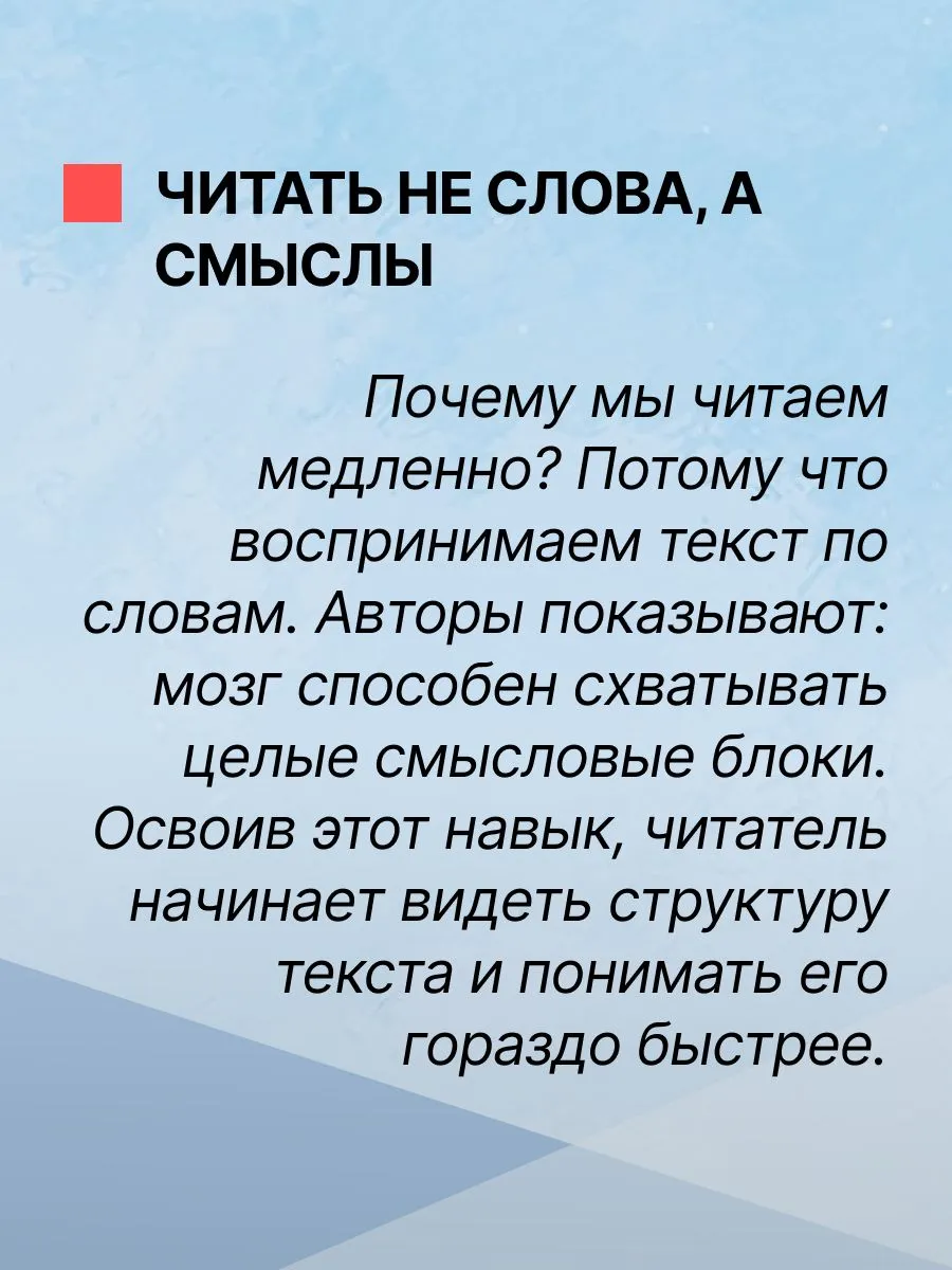 Авторы раскрывают физиологические и психологические основы чтения, объясняют, какие внутренние механизмы замедляют работу с книгой и как их можно перестроить. Читатель познакомится с принципами осмысленной работы с книгой, которые помогают читать целыми смысловыми блоками, быстрее находить главное и лучше запоминать материал.