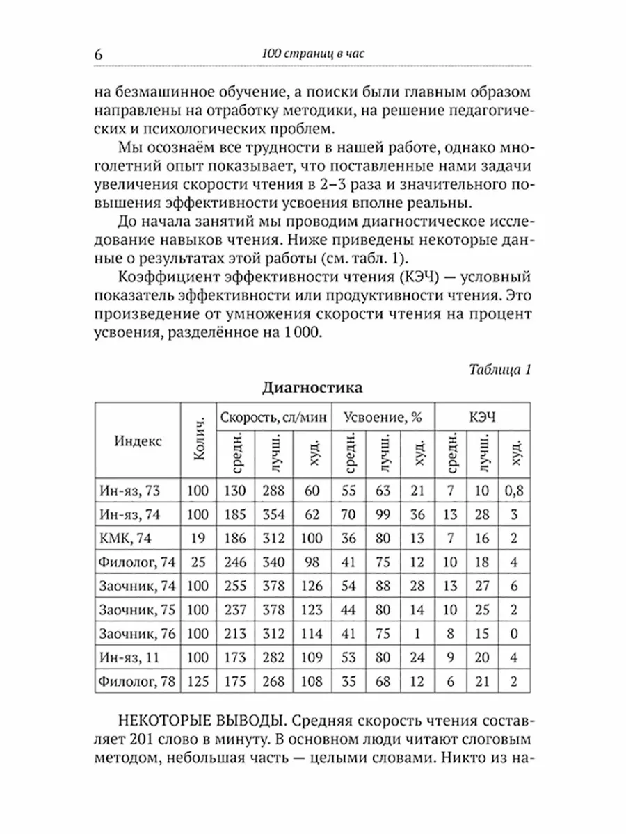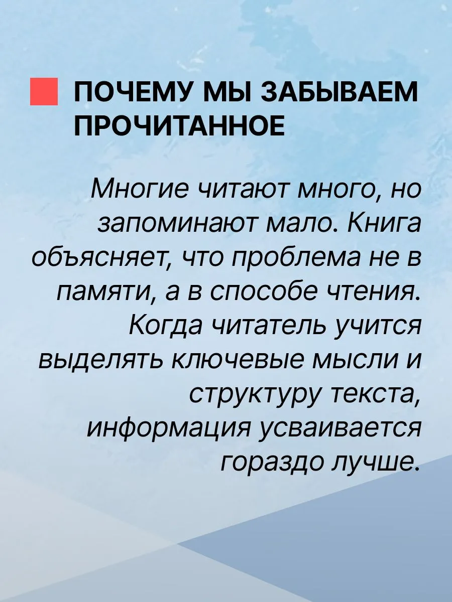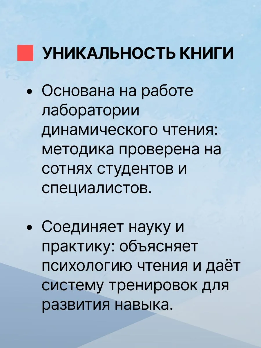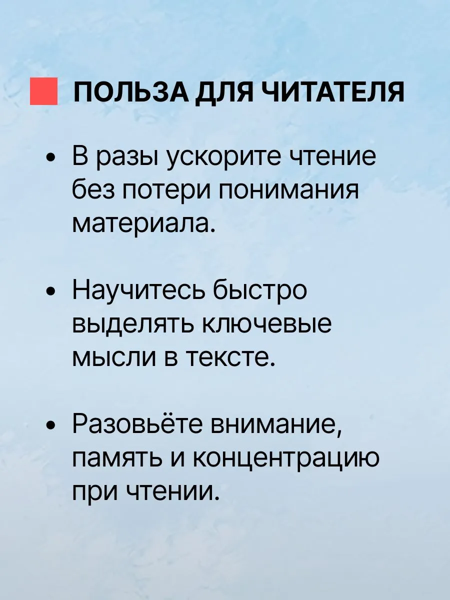 Авторы раскрывают физиологические и психологические основы чтения, объясняют, какие внутренние механизмы замедляют работу с книгой и как их можно перестроить. Читатель познакомится с принципами осмысленной работы с книгой, которые помогают читать целыми смысловыми блоками, быстрее находить главное и лучше запоминать материал.