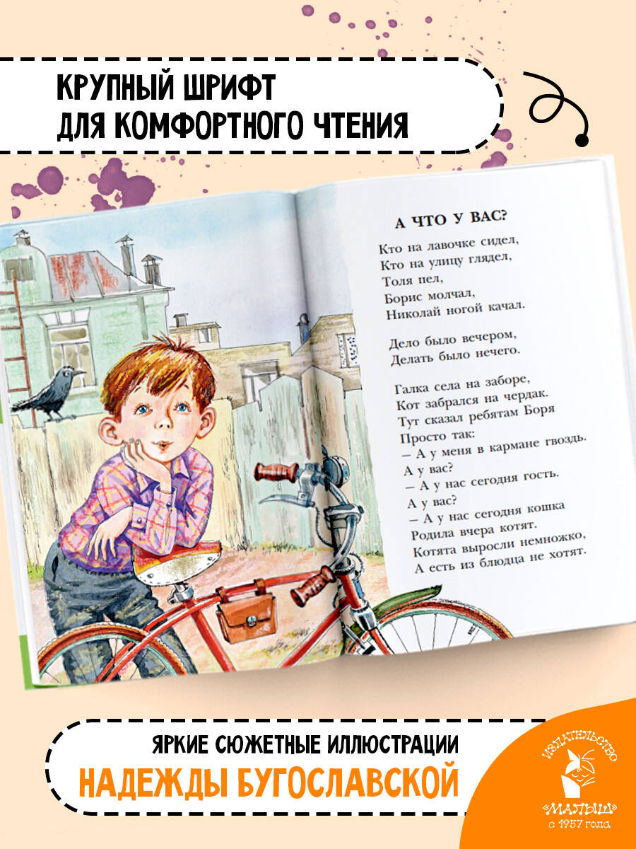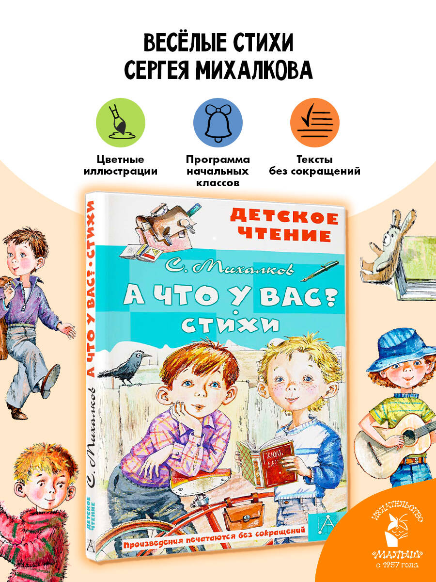 В книгу «А что у вас?» вошли самые знаменитые стихотворения Сергея Михалкова для детей школьного возраста. Школьная пора — очень интересное время: новые открытия, новые друзья, новые знания и, конечно, новые проказы. Сергей Михалков очень точно передаёт чувства и переживания детей, показывает им, как они выглядят со стороны, смеётся вместе с ними и мечтает. Помечтайте и вы вместе с героями этого великолепного сборника стихов!