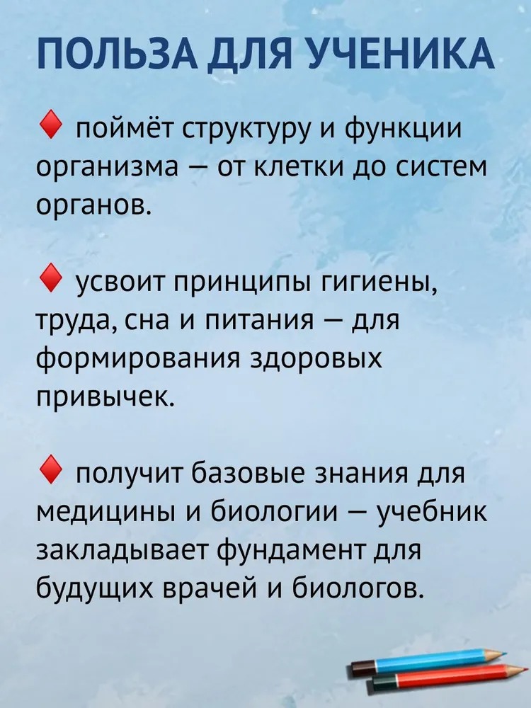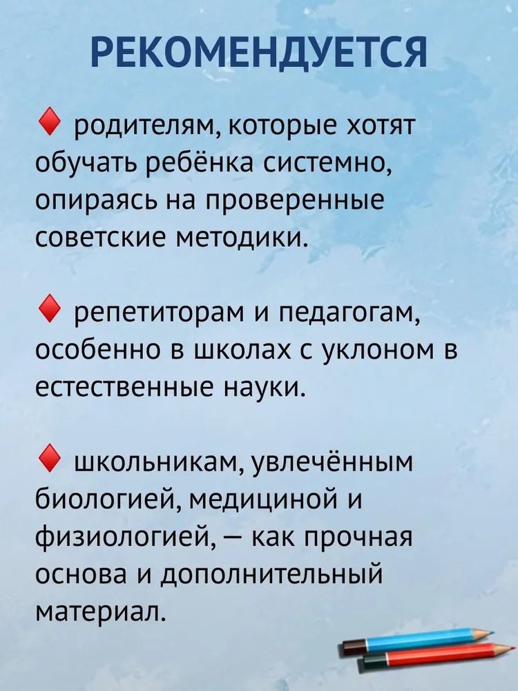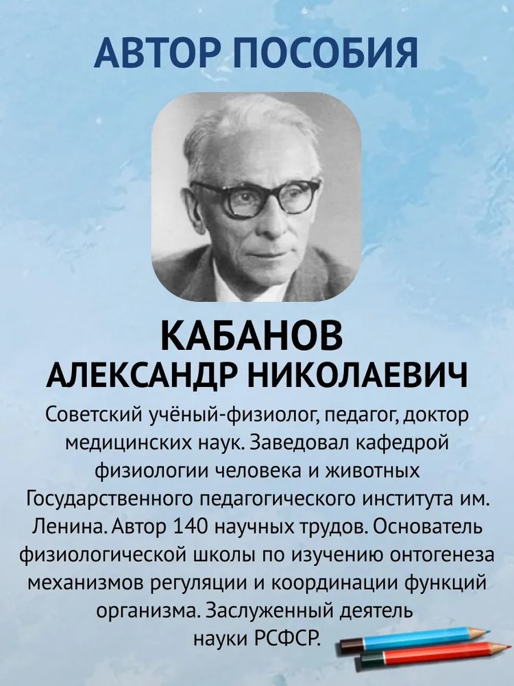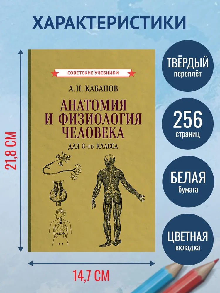 Учебник анатомии и физиологии человека А. Н. Кабанова 1954 г. предназначен для учащихся 8 класса средней школы и знакомит их со строением и жизненными функциями организма. Эти знания помогают понять место человека в природе, его родство с животными, происхождение и развитие. Издание состоит из 11 глав. Школьники изучат функционирование и строение скелета, мышц, основных органов и нервной системы, а также узнают о процессе обмена веществ и энергии. Отдельное внимание уделяется вопросам бытовой гигиены и физиологическим особенностям растущего организма. Теоретический материал снабжён подробными иллюстрациями, заданиями и упражнениями. Книга будет полезна преподавателям, репетиторам, учащимся школ с углублённым изучением биологии, а также родителям, занимающимся с ребёнком самостоятельно.