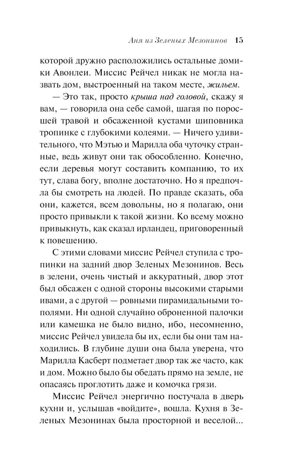 Первая книга из цикла про Аню Ширли в чудесном оформлении обложки Луизы Бакировой. Когда рыжеволосая Аня Ширли приезжает на остров Принца Эдуарда, она уверена, что наконец нашла дом, о котором всегда мечтала. Аня сирота, у которой не было детства, потому что и в приёмных семьях, и в приюте она работала как взрослый, никто не дарил ей тепла, её жизнь до сих пор была «кладбищем надежд». Но её новые приёмные родители в замешательстве, ведь они просили прислать к ним мальчика, чтобы он помогал им на ферме в Зелёных Мезонинах. Девочка кажется им поначалу странной, постоянно попадает в неудачи, но со временем неуёмный оптимизм, богатая фантазия, добродушие Ани покоряют их и жителей Авонлеи. Романы об Ане Ширли — это классическая история взросления со взлётами и падениями, печалями и радостями. В 2017 году вышел очень душевный сериал «Энн», снятый по циклу романов об Ане.