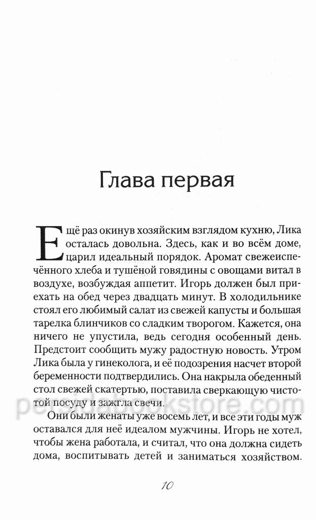 «Слёзы застилали лицо. Реальность происходящего болезненно ворвалась в её размеренную жизнь, вмиг разрушив все мечты и надежды. Неужели она была настолько глупой и слепой, что ничего не замечала? Как давно Игорь обманывает её? «Господи, что это? За что это? — спрашивала она себя. Благополучная, счастливая жизнь с любимым мужем разбилась вдребезги».