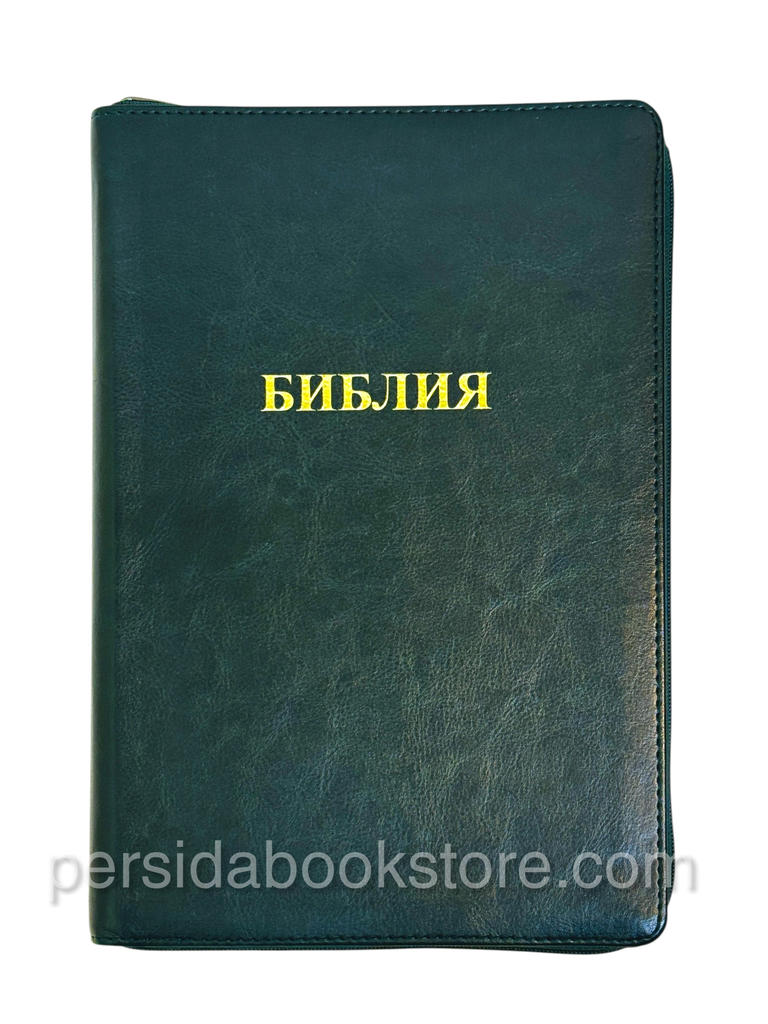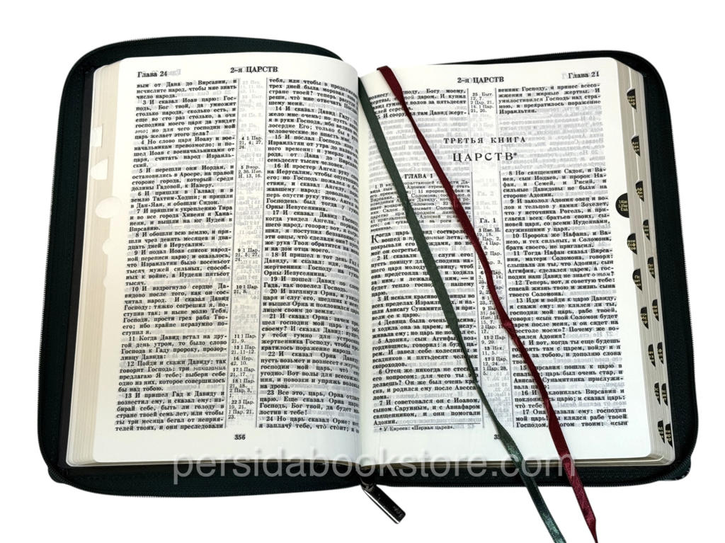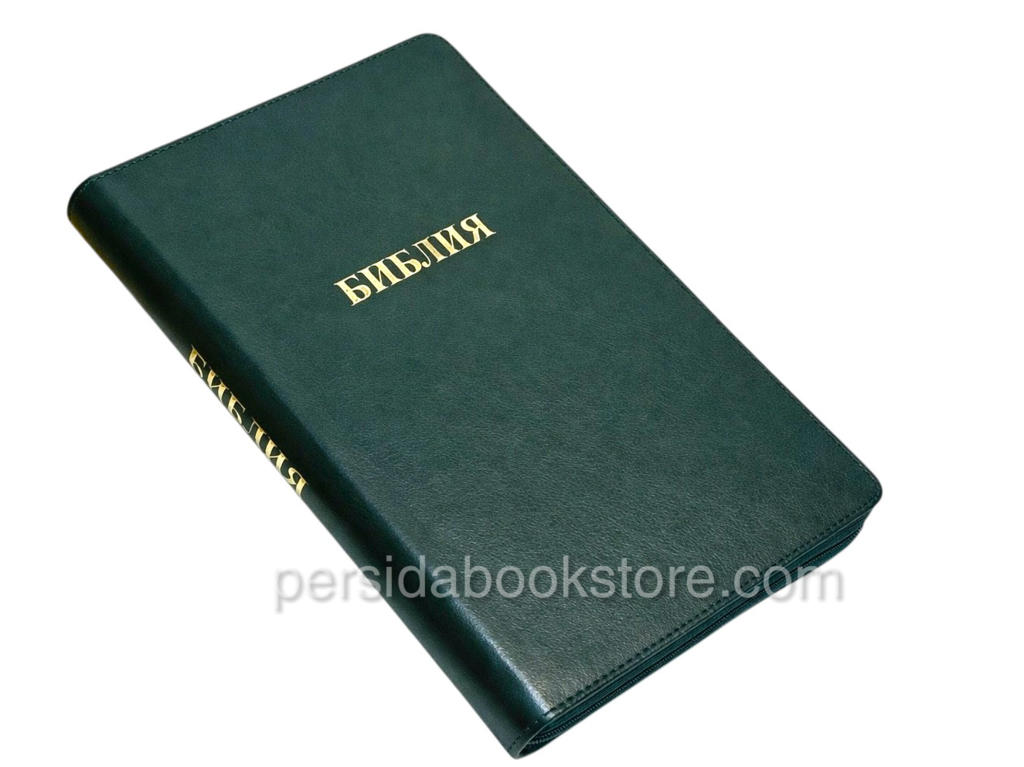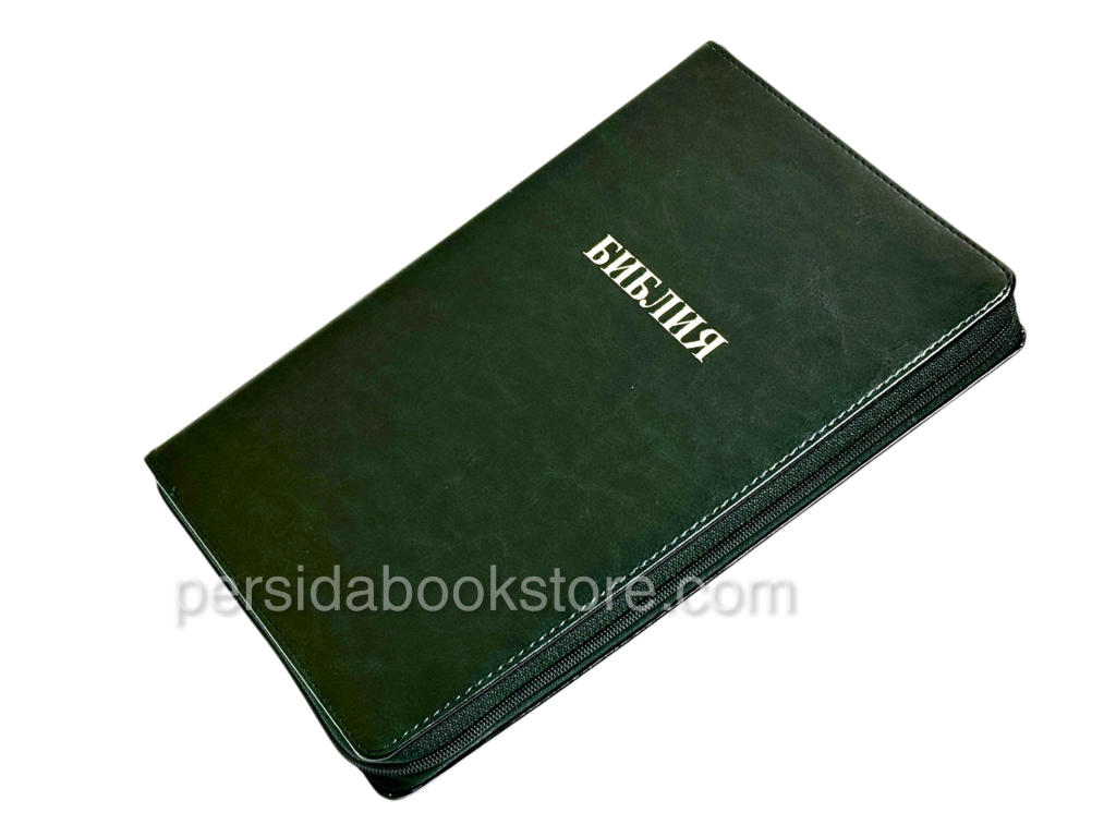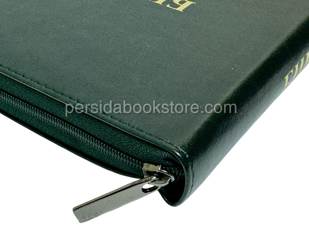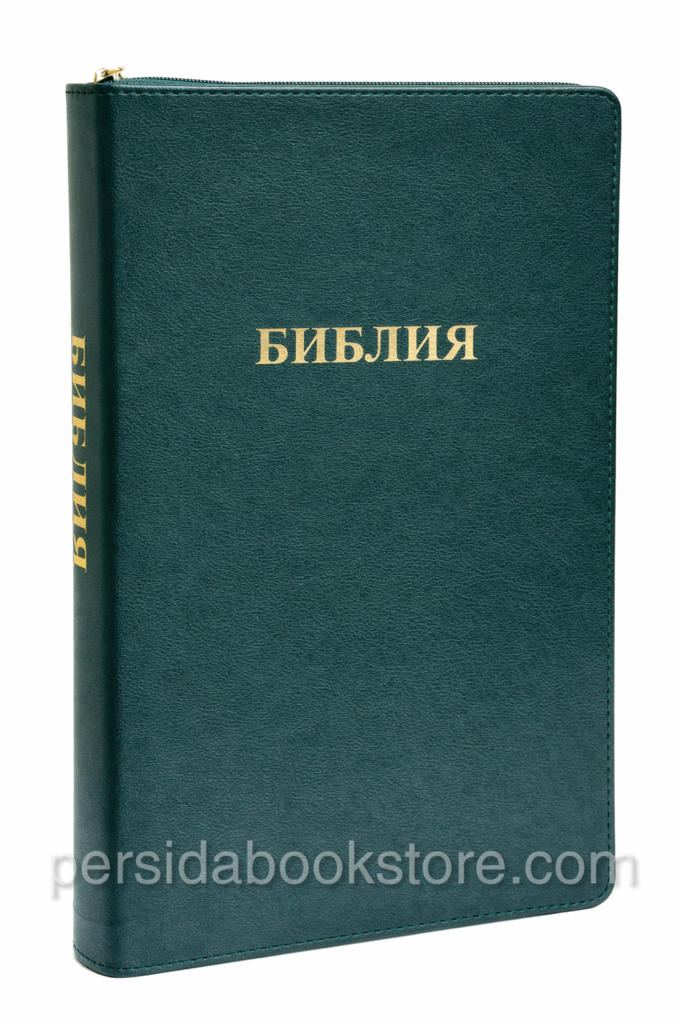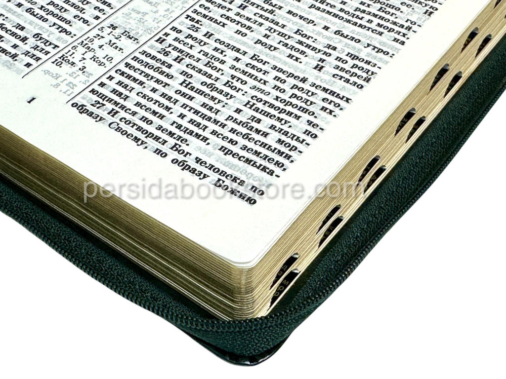 Мягкий переплет из эко кожи, на «молнии», цвет обложки — изумруд, серебряный обрез страниц, индексы для поиска библейских книг. Размер 7″ x 10″ инчей или 18 смх27 см.