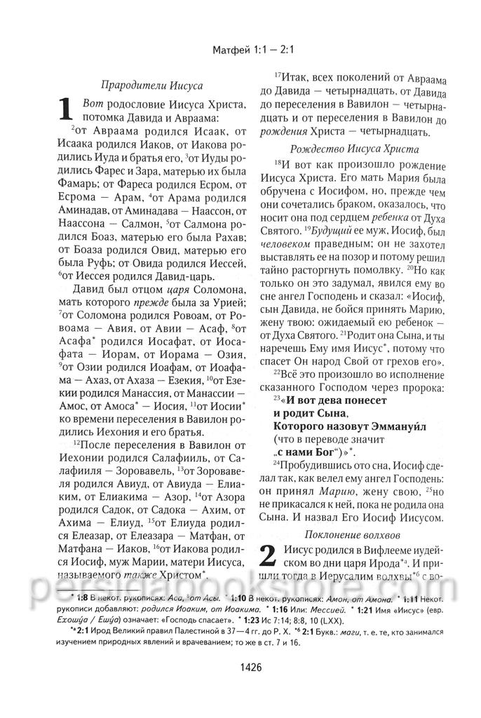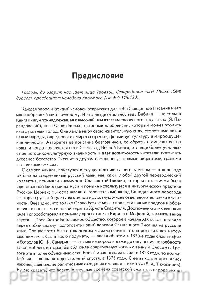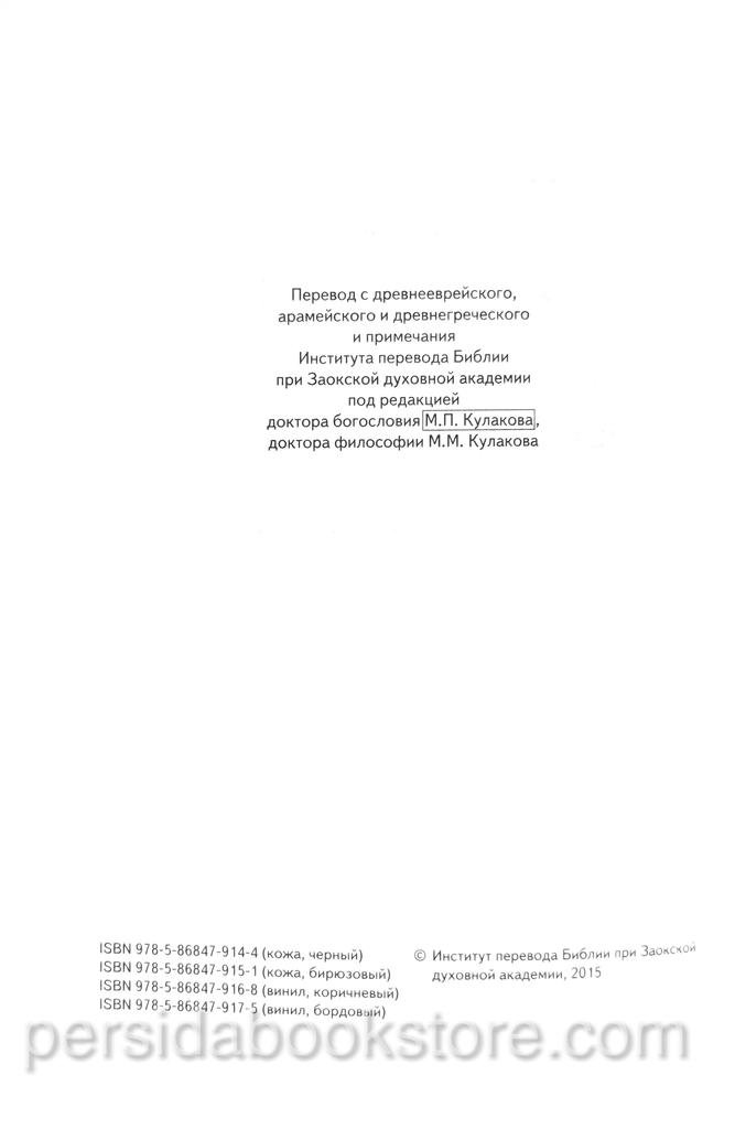 Библия, содержащая книги Священного Писания Ветхого и Нового Завета, в современном русском переводе под руководством Михаила Петровича Кулакова. Имеется комментарий к тексту внизу страницы. Перевод велся на протяжении более 10 лет в «Институте перевода Библии». Новый перевод книг Священного Писания сделан группой ведущих российских ученых Института перевода Библии — библеистов и филологов, принадлежащих разным христианским конфессиям. Цель настоящего издания — предложить читателю в меру возможного точный и художественно убедительный перевод Библии, основанный на новейших научных изданиях древних текстов и последних достижениях современной библеистики. Книга адресована самому широкому кругу читателей.