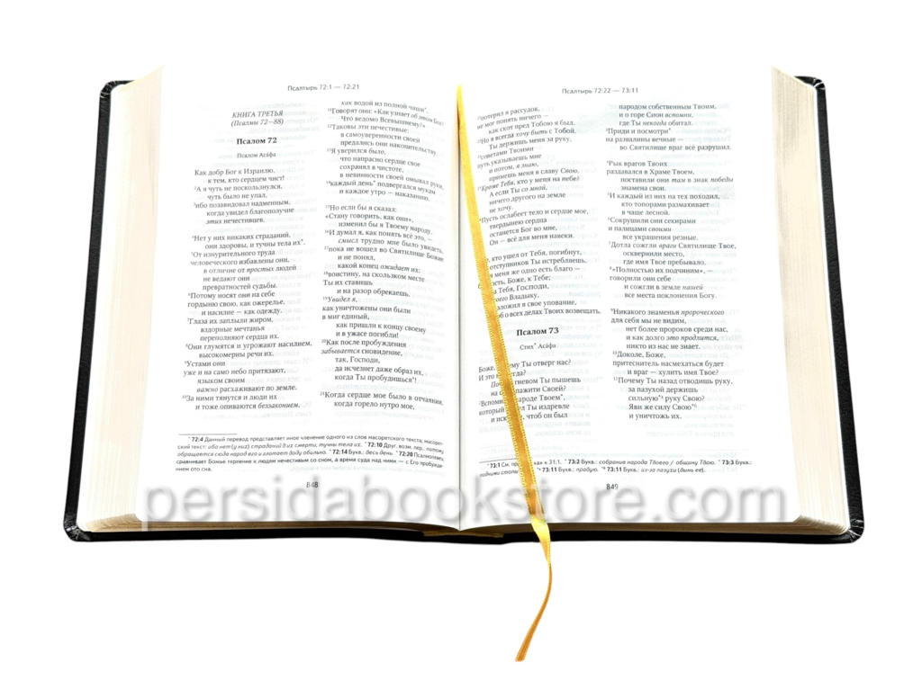 1856 страниц, бумага белая, мягкая обложка, кожа (bonded) цвет черный, формат издания 16х24 см, золотой обрез, закладка, издатель ББИ 2015 год.