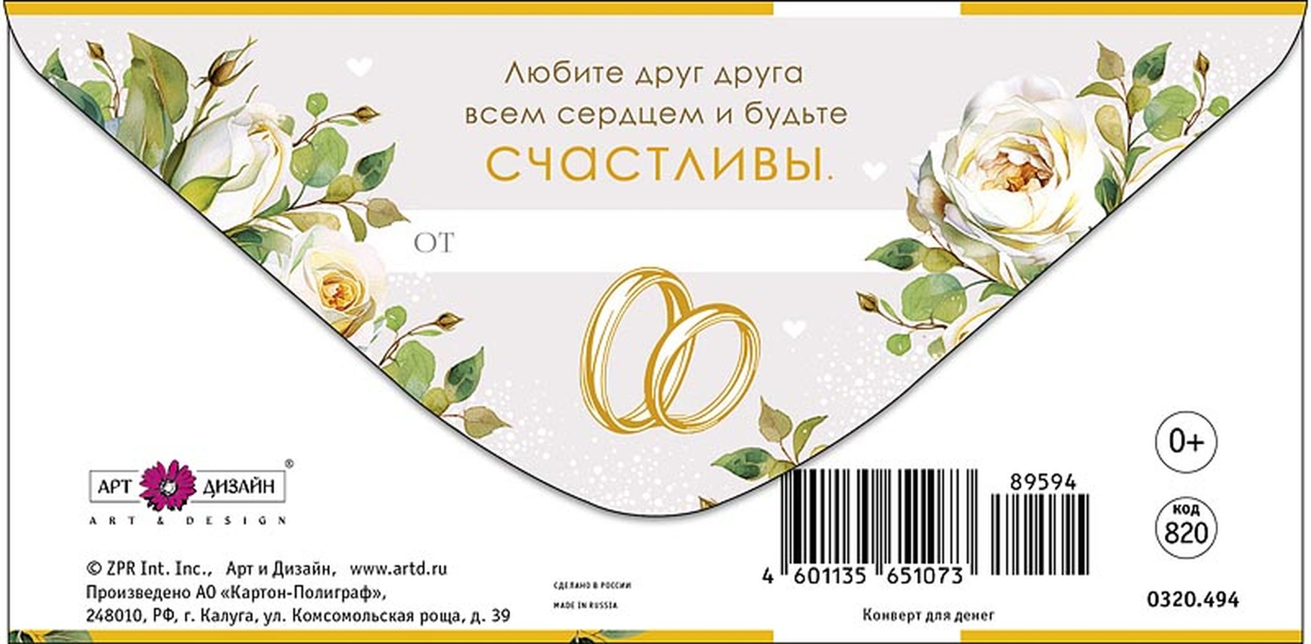 Конверт для денег с рисунком и текстом на обороте: «Любите друг друга всем сердцем и будьте счастливы!»