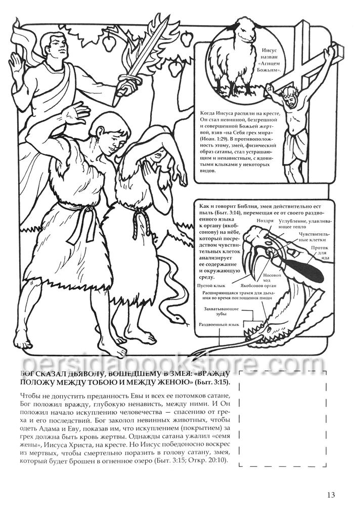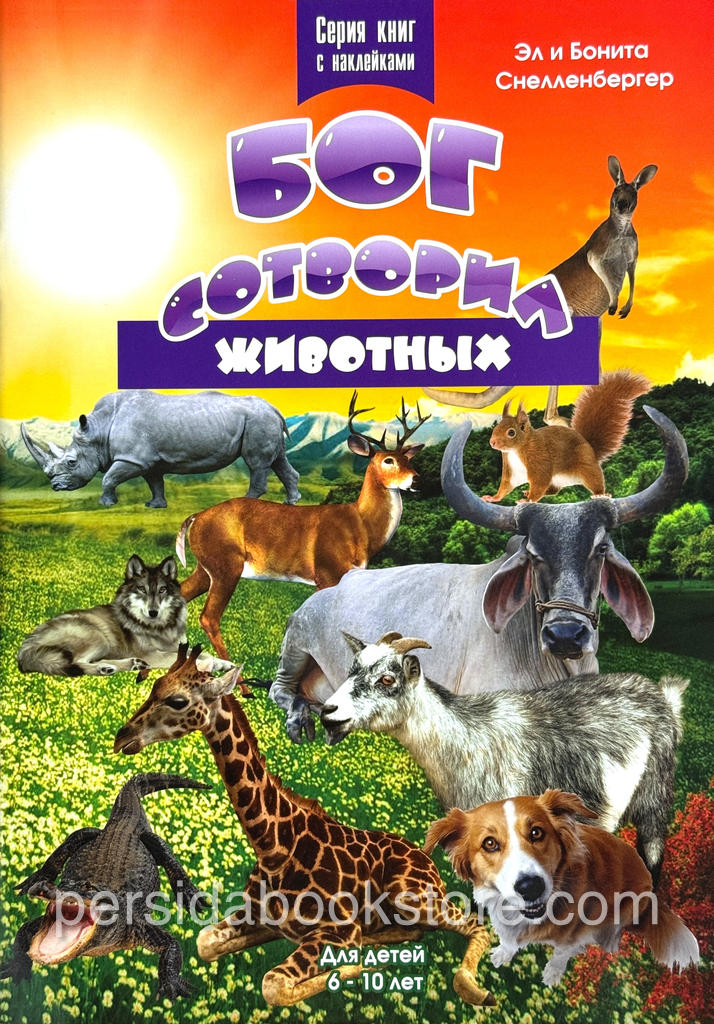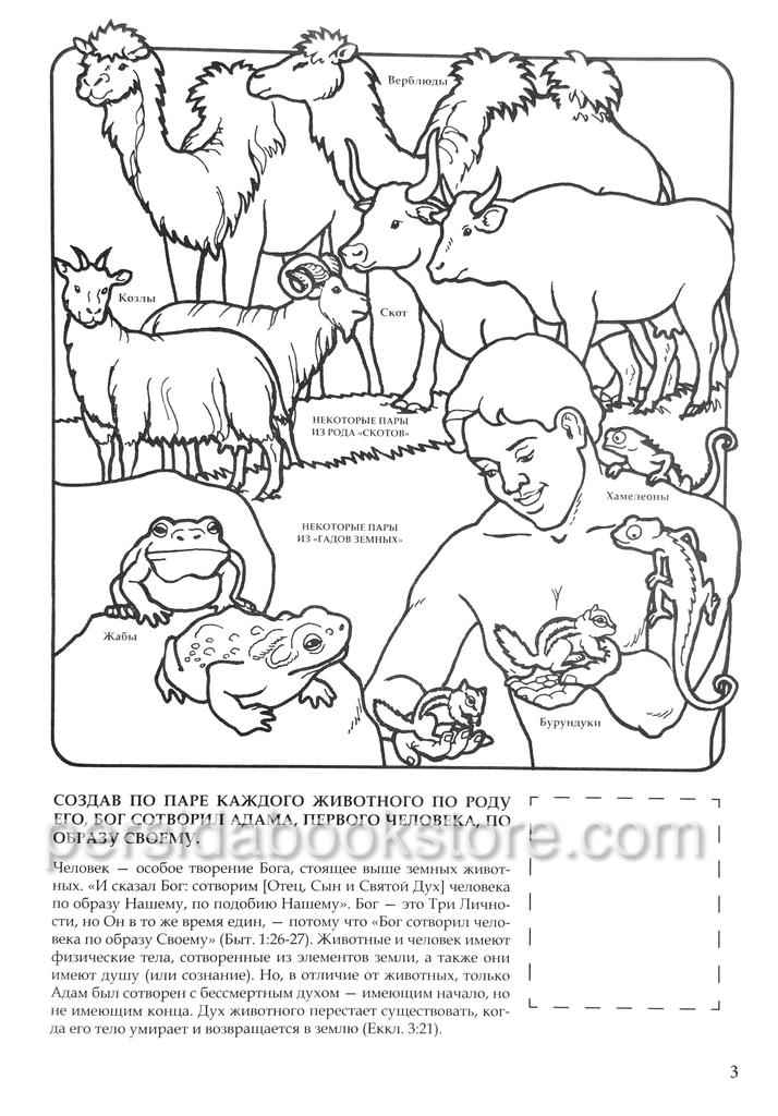 На шестой день творения Бог создал три разных группы животных, обитающих на земле: «И создал Бог (1) зверей земных… и (2) скотов… и (3) всех гадов земных» (Бытие 1:25) — категории основаны в соответствии с интересами человека. Итак, «звери земные», скорее всего, относятся к большим диким животным, которые обычно не живут рядом с человеком. «Скоты» здесь буквально означает домашний скот. «Все гады земные» включают в себя небольших животных, которые ползают или перемещаются близко к земле. Бог сотворил самку и самца, пары, которые рождали бы себе подобных — «по роду их». О том, кого Бог создал ещё, кто называл животных, что с ними было дальше вы узнаете из этой книжки. Все рассказы сопровождаются библейскими стихами и иллюстрациями, которые необходимо раскрасить самостоятельно. В середине книги вы найдёте красочные наклейки-стикеры, которые необходимо наклеить под соответствующей картинкой. Эти стикеры могут послужить в качестве подсказок для раскрашивания страниц этой книги. Всего 32 стикера. Они показывают животных в их естественной раскраске, сотворённой Богом, только нужно правильно подобрать соответствующую картинку.