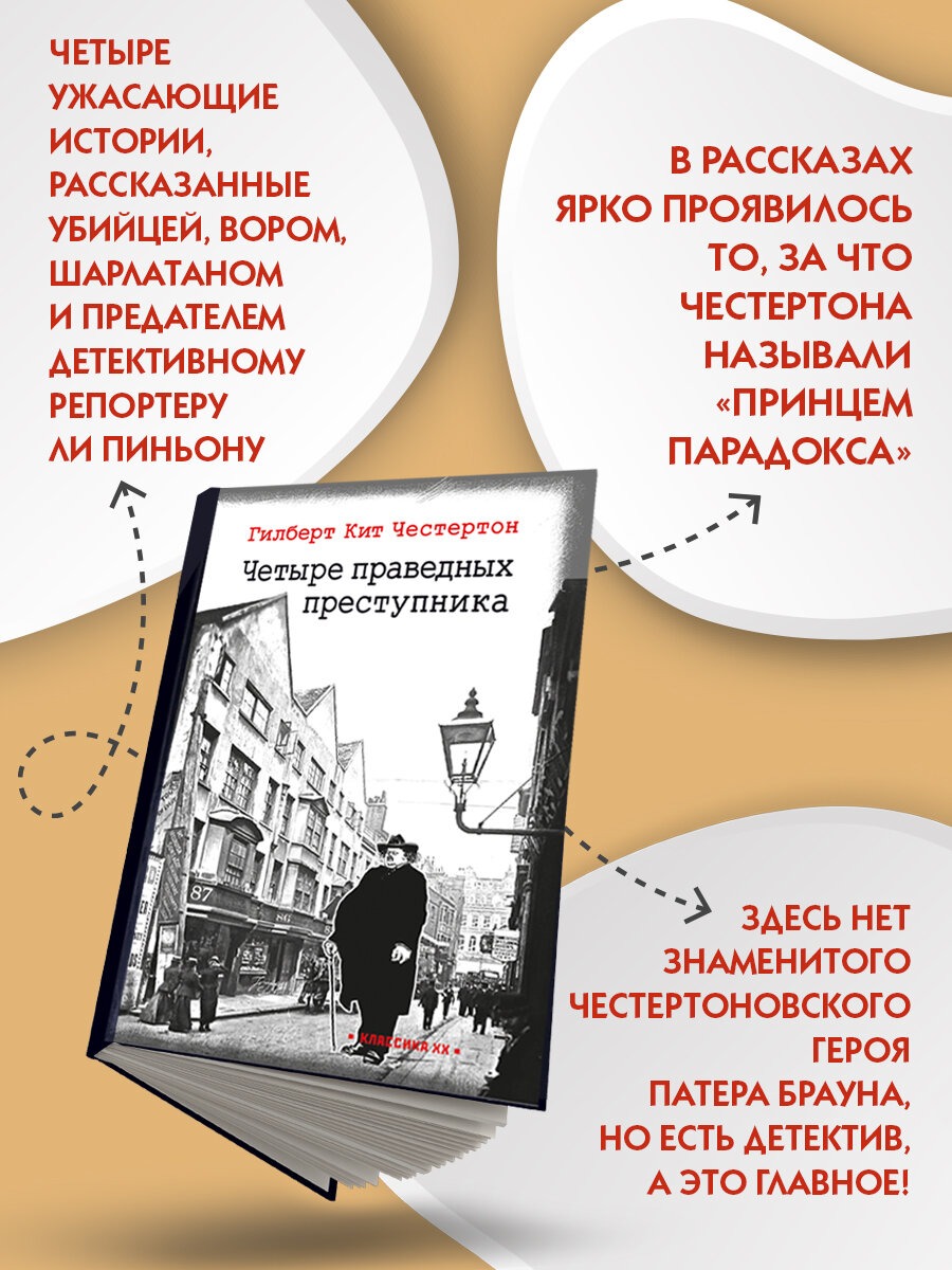 В цикле рассказов «Четыре праведных преступника» ярко отразились особенности творчества знаменитого английского писателя, поэта и философа Г. К. Честертона (1874-1936), за которые его называли принцем парадокса. В этих новеллах преступление неизменно оборачивается благодеянием: покушение совершается ради спасения, вор оказывается благотворителем, шарлатанство помогает спасти невиновного, а изменник предает лишь собственные фантазии.
