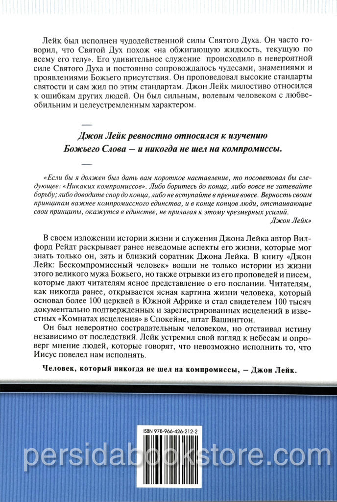 В своем изложении истории жизни и служения Джона Лейка автор Вилфорд Рейдт раскрывает ранее неведомые аспекты его жизни, которые мог знать только он, зять и близкий соратник Джона Лейка. В книгу «Джон Лейк: Бескомпромиссный человек» вошли не только истории из жизни этого великого мужа Божьего, но также отрывки из его проповедей и писем, которые дают читателям ясное представление о его послании. Читателям, как никогда ранее, открывается ясная картина жизни человека, который основал более 100 церквей в Южной Африке и стал свидетелем 100 тысяч документально подтвержденных и зарегистрированных исцелений в известных «Комнатах исцеления» в Спокейне, штат Вашингтон.