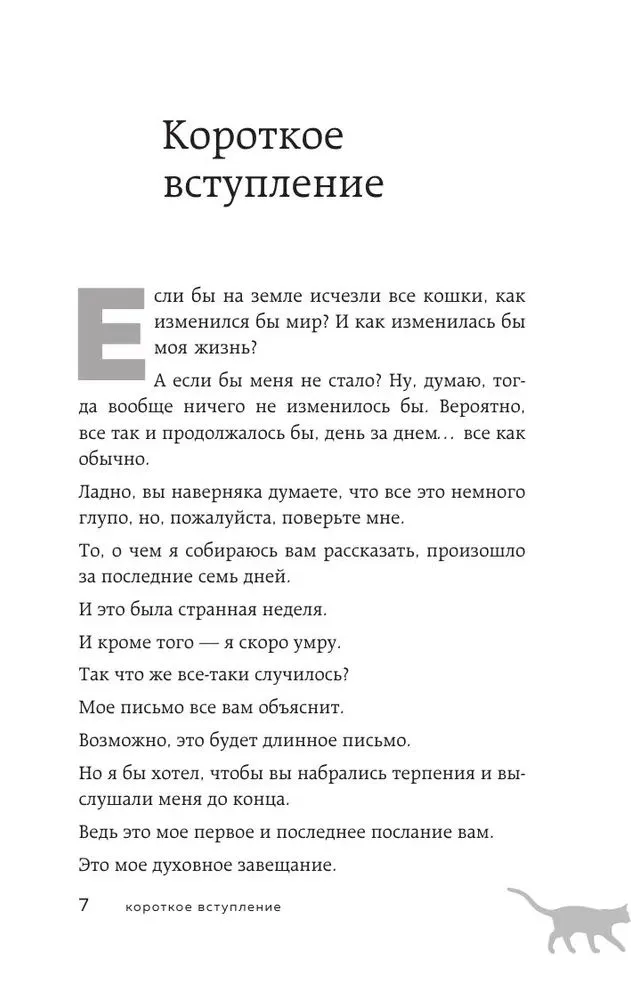 Международный феномен, проданный тиражом более двух миллионов экземпляров! Это согревающая, забавная и глубокая книга о смысле жизни. Дни молодого почтальона сочтены. Оторванный от своей семьи и живущий один с со своим котом Капустой, он не был готов к страшному диагнозу: жить ему осталось всего несколько месяцев. Но прежде чем он сможет привести свои дела в порядок, появляется дьявол с очень необычным предложением. Темная сила обещает продлить умирающему жизнь, но в обмен за каждый дополнительный день одна вещь в мире будет исчезать бесследно… И вот начинается очень странная неделя, которая ставит молодого почтальона и его любимого кота на грань существования. С каждым исчезающим предметом почтальон размышляет о жизни, которую он прожил, о своих радостях и сожалениях, а также о людях, которых он любил и потерял.
