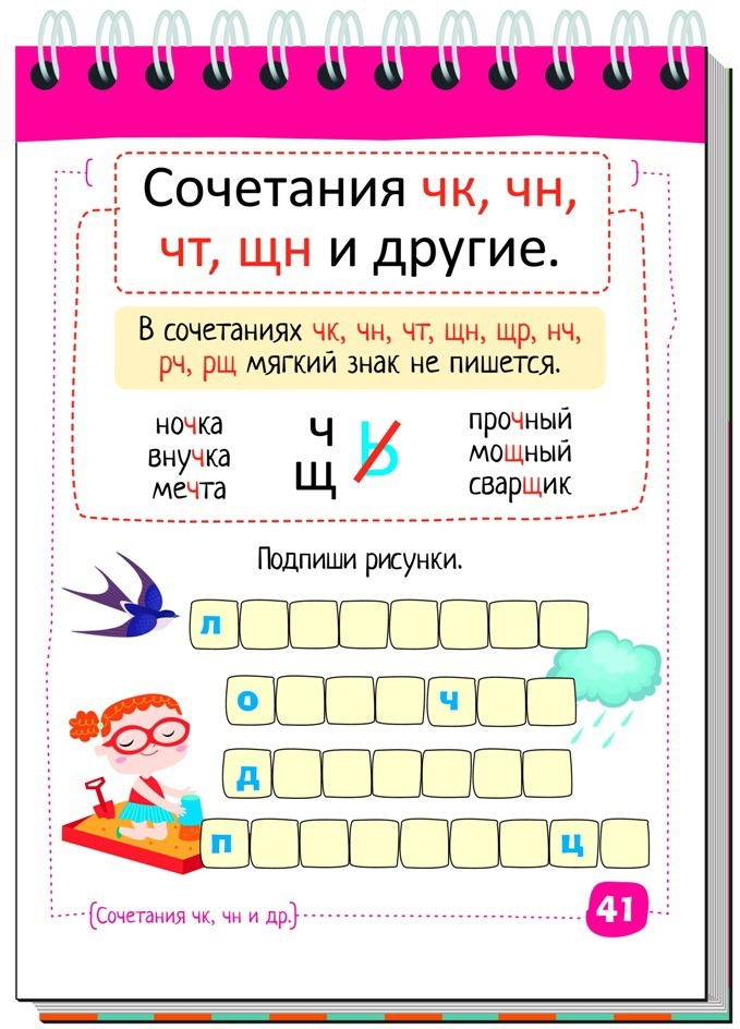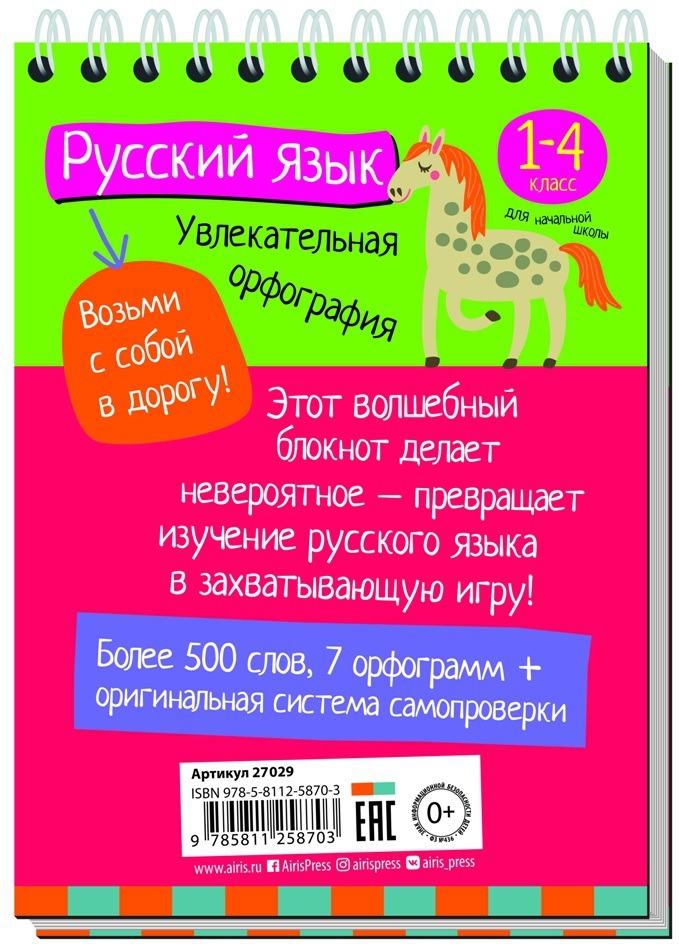 Блокнот «Увлекательная орфография» по русскому языку. В нем содержится более 500 слов и 7 орфограмм на несколько важных правил русского языка, которые ребёнок должен усвоить в начальной школе: правописание двойных согласных, мягкого и твёрдого знака, приставок, суффиксов и сложных слов с соединительными гласными. Кроссворды, ребусы, анаграммы, лабиринты и другие увлекательные игры-задания помогут ребёнку легко запомнить правила русского языка и научиться грамотно писать даже самые трудные слова, в которых нередко допускаются ошибки. Для повторения слов и отработки их правописания в блокноте заложена оригинальная система самопроверки — задания «Проверь себя» и ответы в конце блокнота. Простота и лёгкость использования блокнота позволяют выполнять задания не только дома и в школе, но и в транспорте и на природе, что делает обучение непринуждённым и в то же время эффективным. Издание для досуга ориентировано на учащихся начальной школы.