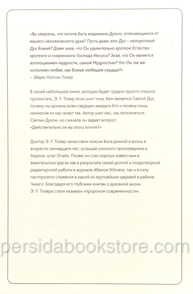Эту книгу не получится просто бегло пролистать, Э. У. Тозер представляет ясное учение о том, Кем является Святой Дух, почему мы должны желать Его силы, и почему лишь немногие действительно стремятся к жизни, исполненной Святым Духом.