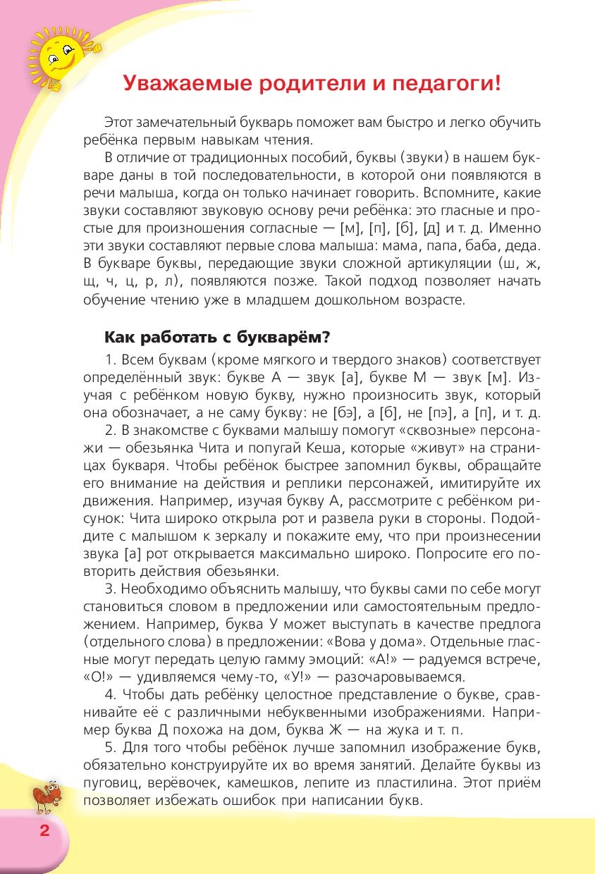 В отличие от традиционных пособий, буквы (звуки) в нашем букваре представлены, начиная от простых для произношения и заканчивая сложными. Таким образом обучать чтению можно не только дошкольников, но и малышей, начинающих произносить свои первые слова; детей испытывающих проблемы с речью. Этап соотнесения звука с буквой является одним из самых сложных. Наш букварь значительно упрощает этот процесс, благодаря весёлым персонажам, которые дают зрительные и двигательные подсказки малышу.