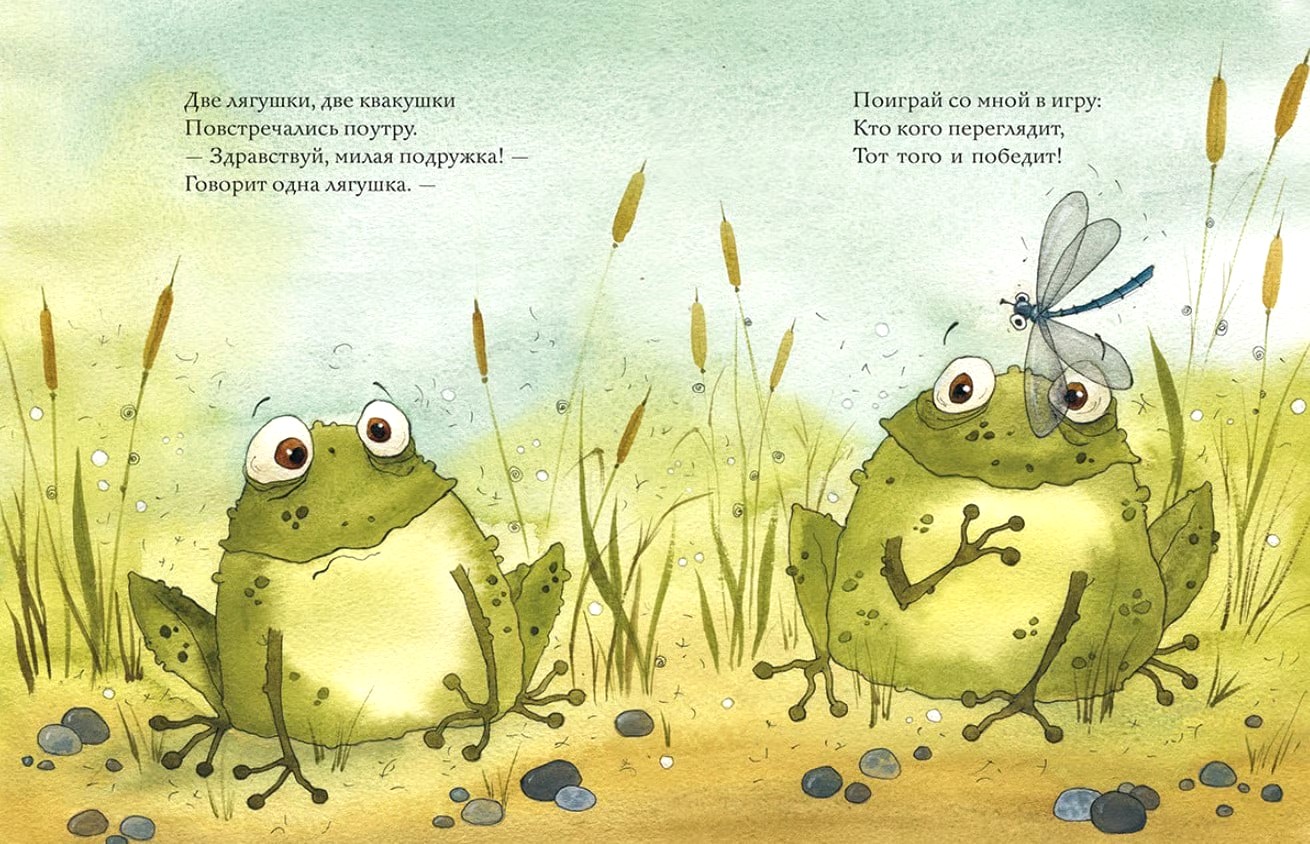 Две Лягушки ранним летним утром затеяли игру в гляделки. Кто же из них кого переглядит? Пришло время обеда — они всё глядят друг на друга. Налетела и отгремела гроза — не сдаются квакушки. Вот уже и осень близится — неужели лягушки так и будут сидеть посреди реки, неужели не бросят свою игру?