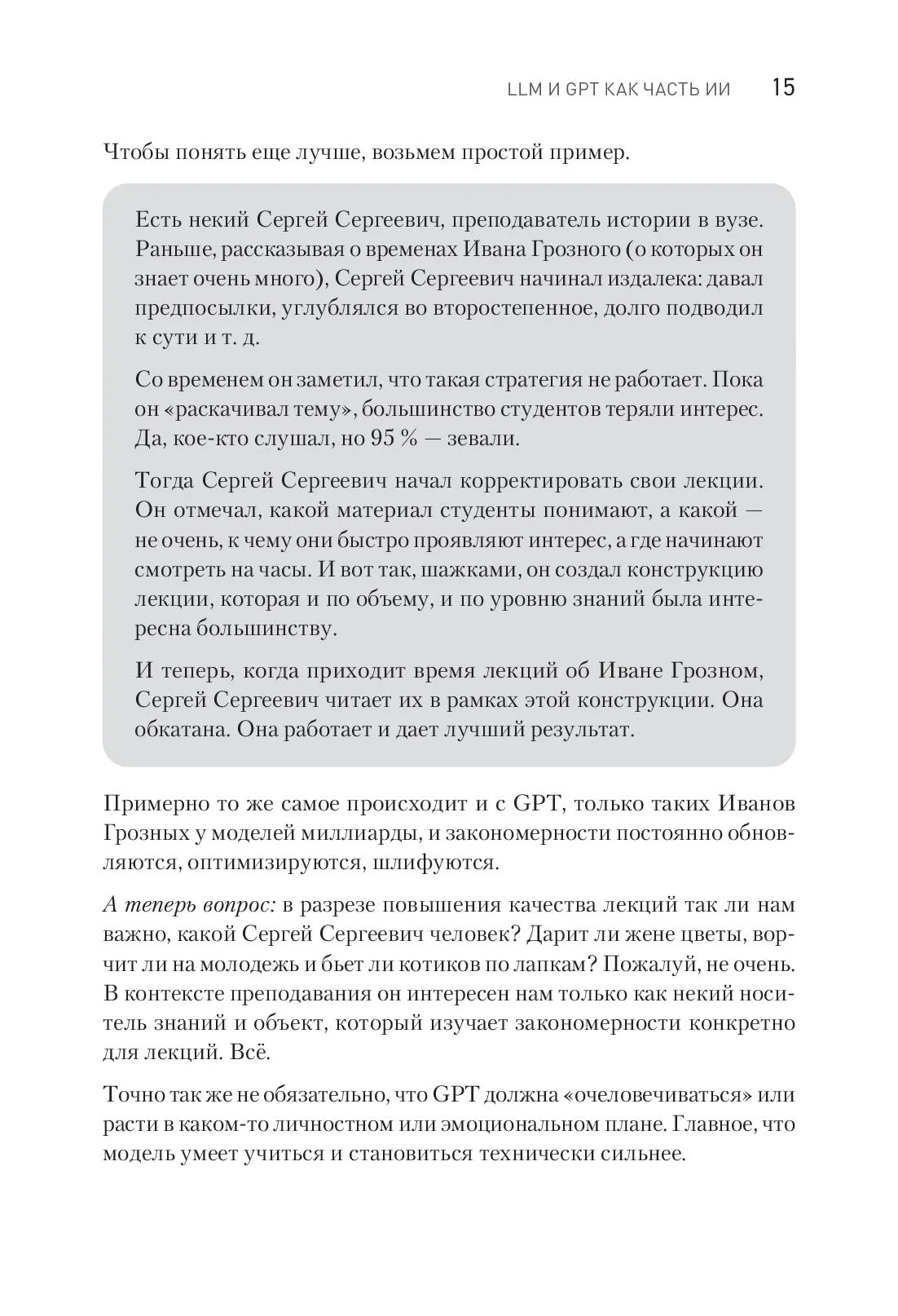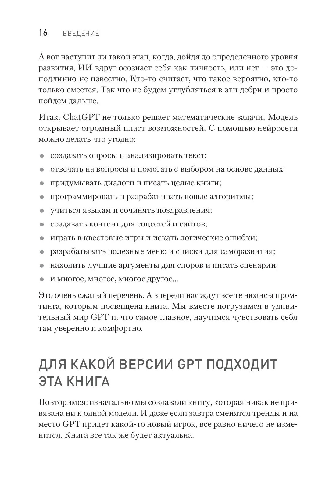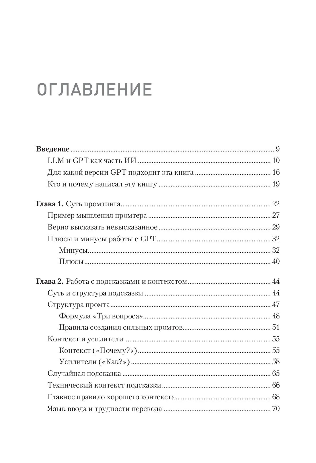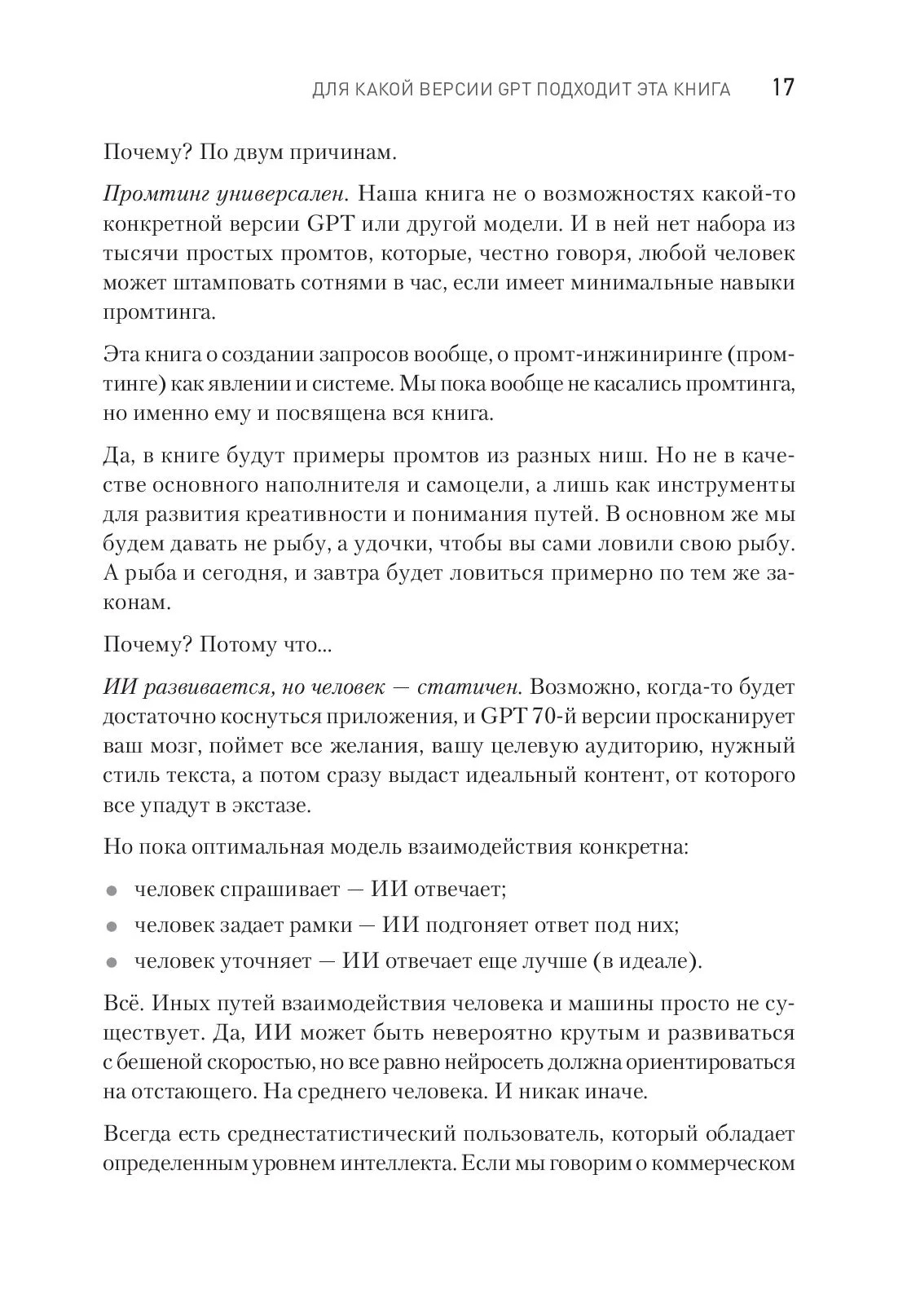 Нейросети за короткое время радикально изменили правила и общее соотношение сил в большинстве ниш. Навыки общения с искусственным интеллектом дают немалые карьерные, финансовые, личностные и другие бонусы. А скоро они станут обязательной необходимостью. Умение создавать правильные подсказки для контентных нейросетей (промпт-инжиниринг) позволяет перейти на более серьезный уровень общения с ИИ. Мастерство гуманитарного программирования доступно каждому: оно не требует специальных знаний или особого образования. Это первая в серии книга Петра Панды , практикующего промпт-инженера, о развитии мастерства гуманитарного программирования. Она поможет понять основы формулирования подсказок и начать создавать первые промпты для бизнеса, карьеры, обучения, досуга, саморазвития, других сфер жизни. Издание станет отличным стартом для тех, кто только начинает работу с ИИ и хочет органично войти в масштабируемый и увлекательный мир создания промптов. 5 причин прочитать эту книгу: 1. Вы откроете возможности чата GPT, его фишки и закономерности. 2. Вы получите интересные идеи промптинга (подбора запросов и подсказок чату GPT). 3. Вы прокачаете креативность и увидите практичные примеры работы с нейросетью. 4. Вы сможете создавать качественный контент для бизнеса, учебы, соцсетей и личной жизни. 5. Издание не привязано к отдельным версиям GPT, поэтому подойдет всем, кто желает получить навыки промтинга (создания подсказок/ запросов для нейросетей).