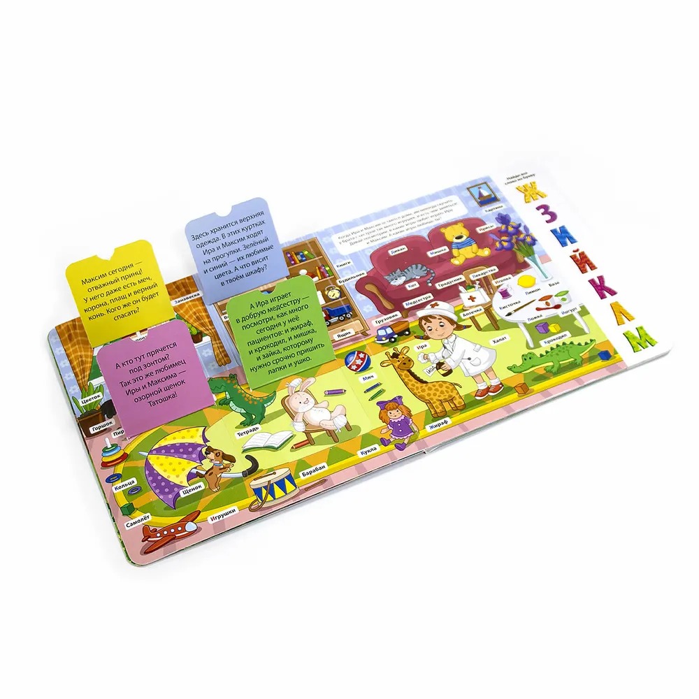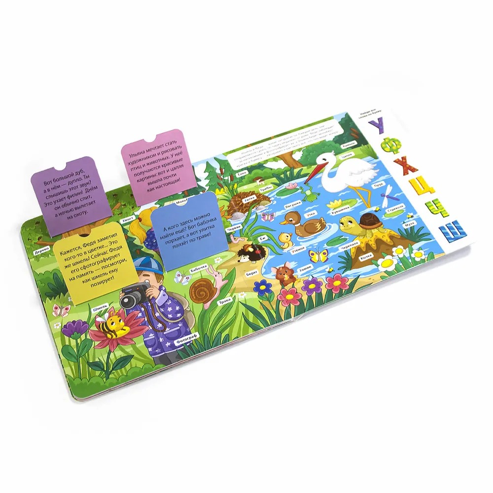 Книжка с окошками «Азбука» — это развлекательное пособие для детского развития. Благодаря этой книге ребёнок выучит все буквы алфавита без особого труда. В книге —10 красочных страниц с различным содержанием, поэтому ребёнку будет интересно следить за сюжетом. Плюс на каждом развороте этого пособия есть окошки с занимательными фактами об окружающем мире и задания на поиск слов! Ребёнок пополняет словарный запас, учит буквы – и всё это в лёгкой игровой форме!