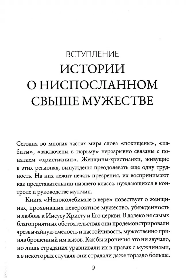 360 страниц, мягкая обложка, издатель Благая весть. Книга «Непоколебимые в вере» повествует о женщинах, проявивших невероятное мужество, убежденность и любовь к Иисусу Христу и Его церкви. В далеко не самых благоприятных обстоятельствах они продемонстрировали чрезвычайную смелость и настойчивость, мужественно приняв брошенный им вызов. Некоторые женщины многие годы провели в тюрьме, другие же никогда не были в заключении, но пережили иные немыслимые испытания. Это женщины разного возраста, с различным религиозным прошлым: от христианства и ислама до индуизма и атеизма. Тем более удивительно, как схожи их истории: каждая женщина обладала высокой принципиальностью и посвященностью Христу, благодаря чему они сумели преодолеть человеческие слабости и пережить, казалось бы, невозможное.