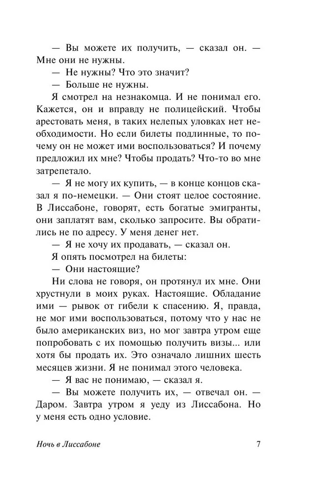 Это не только одна ночь в Лиссабоне, в которую и уместился весь этот рассказ. Это не просто случайная встреча двух отчаявшихся людей, один из которых тщетно пытается найти два билета на пароход до Америки, а другой — ищет собеседника, чтобы излить ему душу. Это настоящая исповедь отважного, смелого человека, на долю которого выпали немыслимые по тяжести испытания. Это история целого поколения людей, столкнувшихся с войной, попавших в тиски фашизма. Это еще и история любви, перед которой отступает даже смерть.