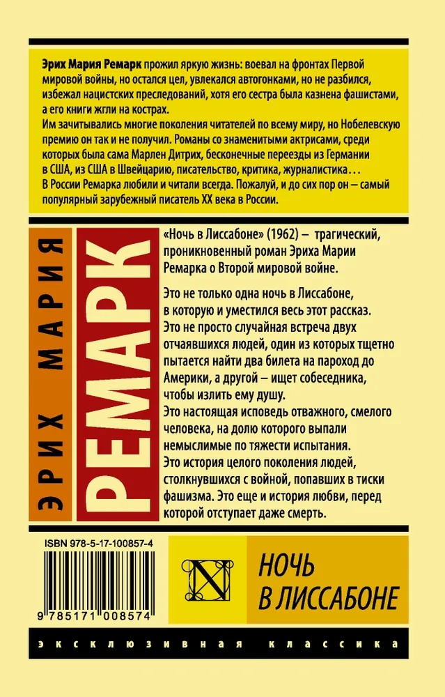 «Ночь в Лиссабоне» (1962) — трагический, проникновенный роман Эриха Марии Ремарка о Второй мировой войне.