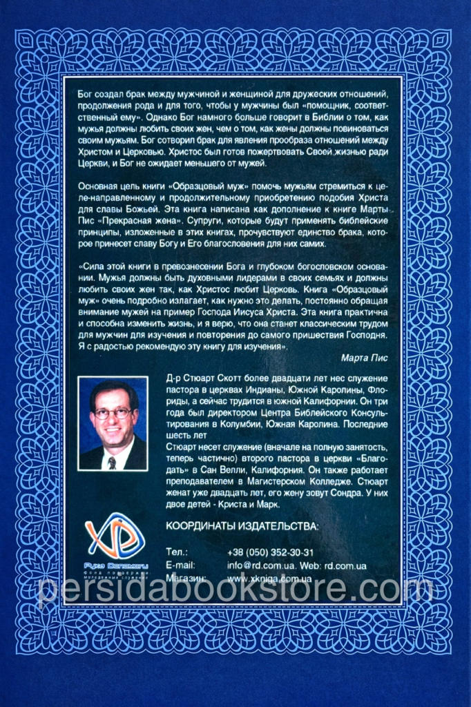 «Сила этой книги в превознесении Бога и глубоком богословском основании. Мужья должны быть духовными лидерами в своих семьях и должны любить своих жен так, как Христос любит Церковь. Книга «Образцовый муж» очень подробно излагает, как нужно это делать, постоянно обращая внимание мужей на пример Господа Иисуса Христа. Эта книга практична и способна изменить жизнь, и я верю, что она станет классическим трудом для мужчин для изучения и повторения до самого пришествия Господня. Я с радостью рекомендую эту книгу для изучения.» (Марта Пис)