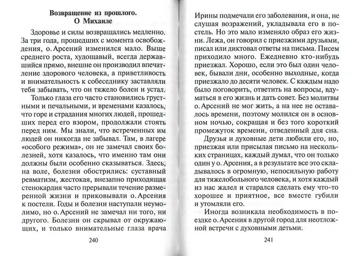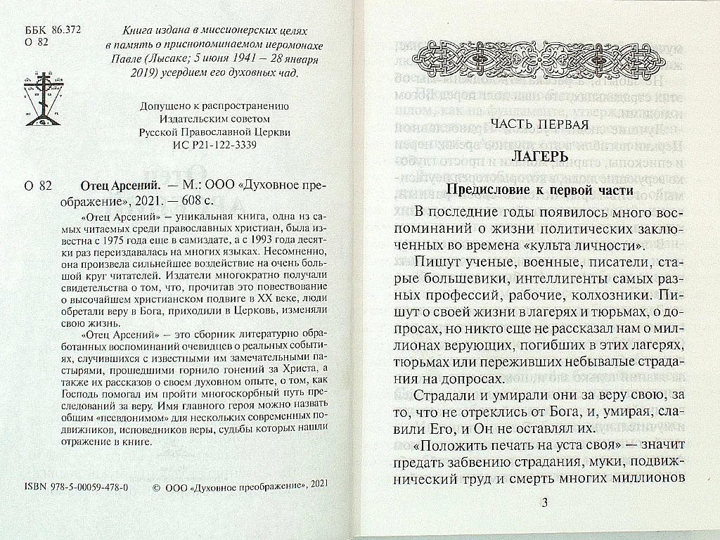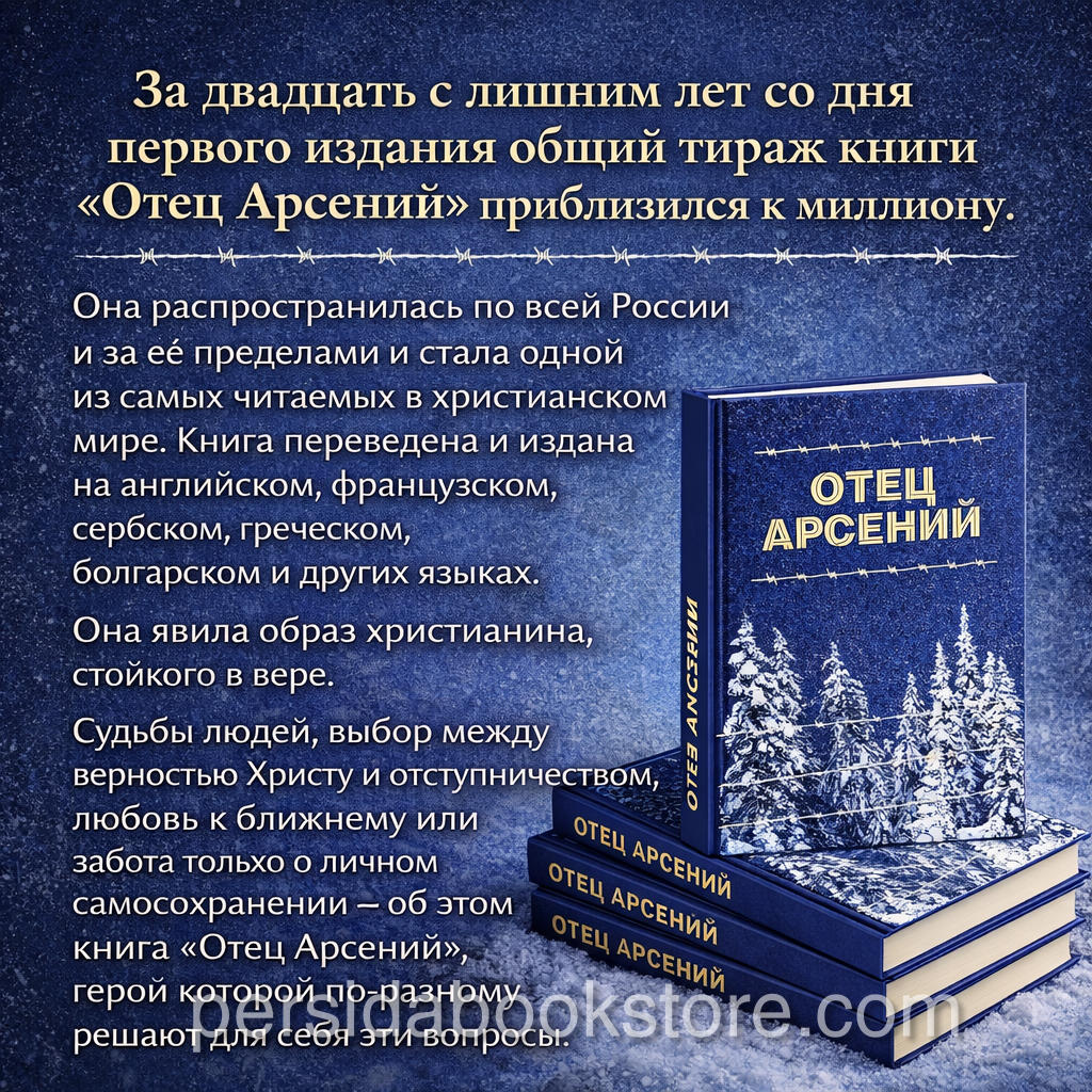 «За двадцать с лишним лет со дня первого издания общий тираж книги «»Отец Арсений»» приблизился к миллиону. Она распространилась по всей России и за ее пределами и стала одной из самых читаемых в христианском мире. Книга переведена и издана на английском, французском, сербском, греческом, болгарском и других языках. Она явила образ христианина, стойкого в вере. Судьбы людей, выбор между верностью Христу и отступничеством, любовь к ближнему или забота только о личном самосохранении — об этом книга «Отец Арсений», герои которой по разному решают для себя эти вопросы. Вашему вниманию предлагается новая редакция уже полюбившейся читателю книги.