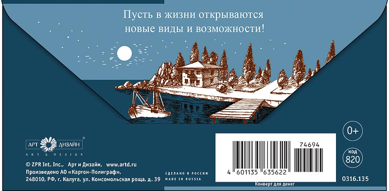 «Пусть в жизни открываются новые виды и возможности!» Подарочный конверт с текстом на обороте.