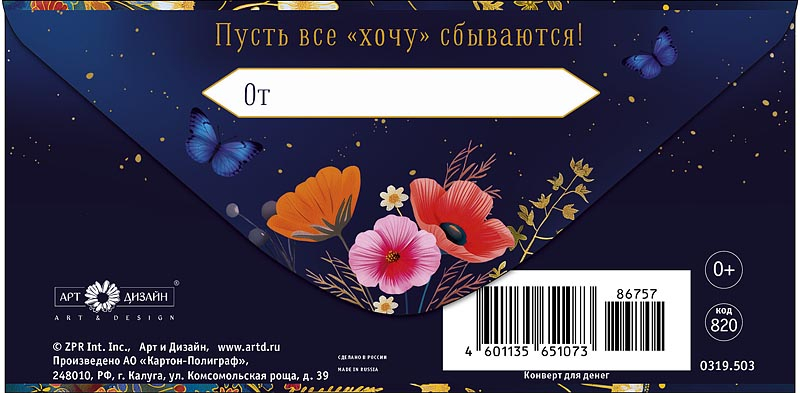 Конверт для денег с рисунком и текстом на обороте: «Пусть все «хочу» сбываются!».