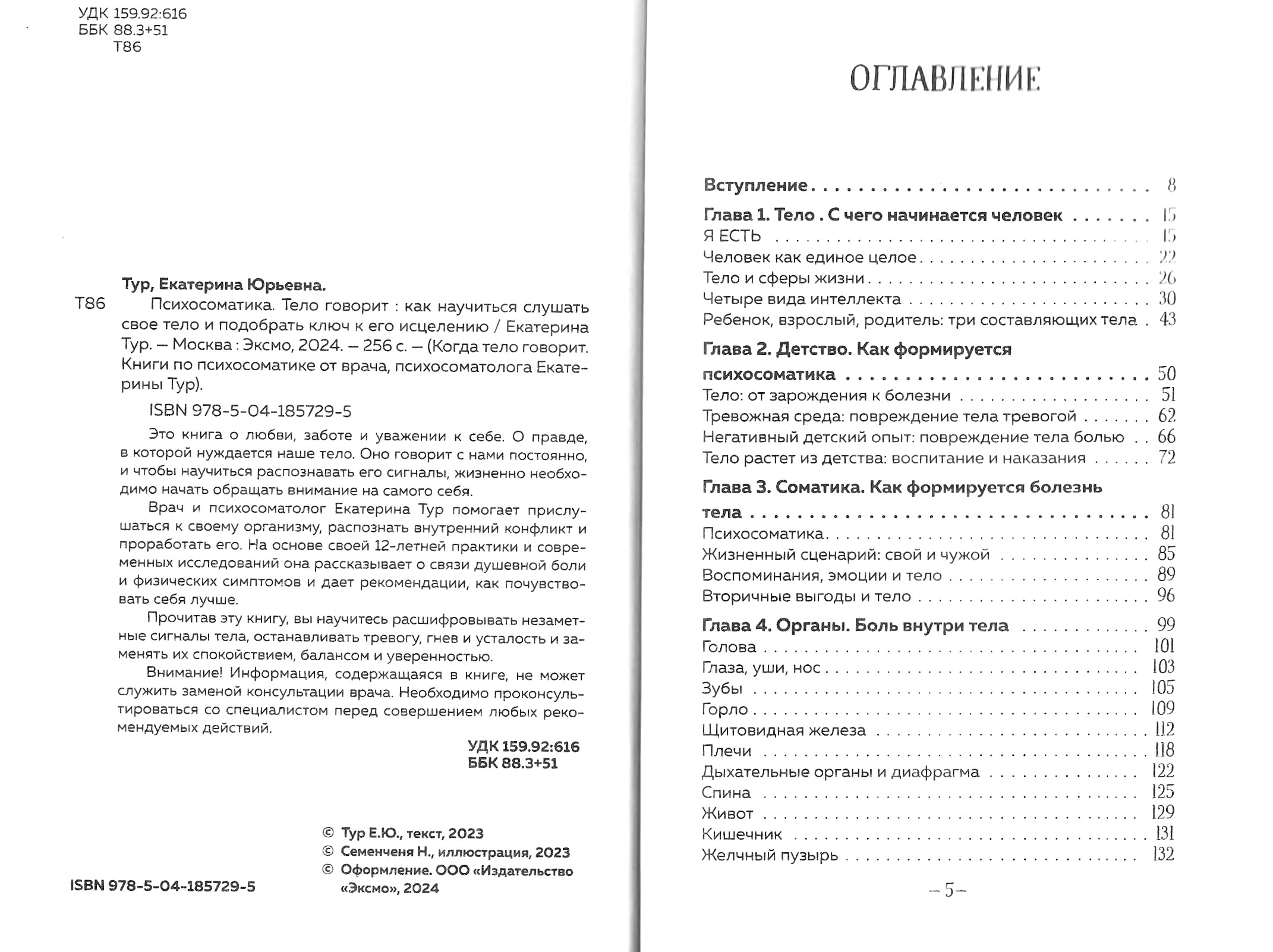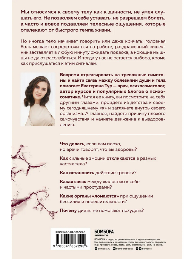 Автор книги «Психосоматика: тело говорит» Екатерина Тур рассказывает, как важно слушать свое тело и уметь распознавать его сигналы. «Иногда болезнь действительно формируется случайно: под действием факторов, генетических поломок или стечения обстоятельств. Но чаще всего телесная боль становится отражением той душевной боли, которую человек носил в себе десятилетиями». Это ценная книга о влиянии наших мыслей и поведения на здоровье всего организма.
