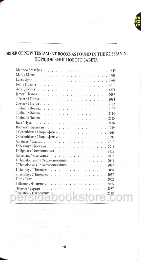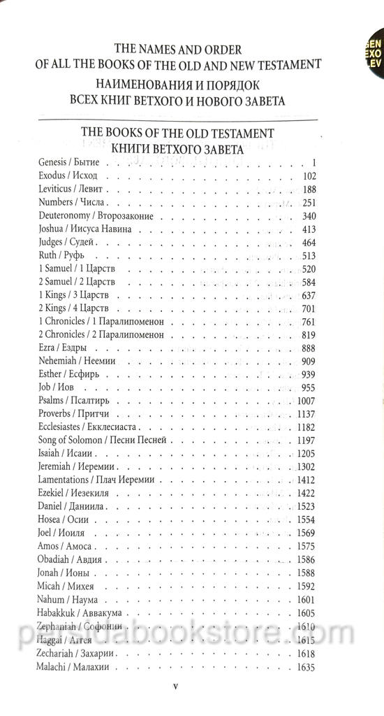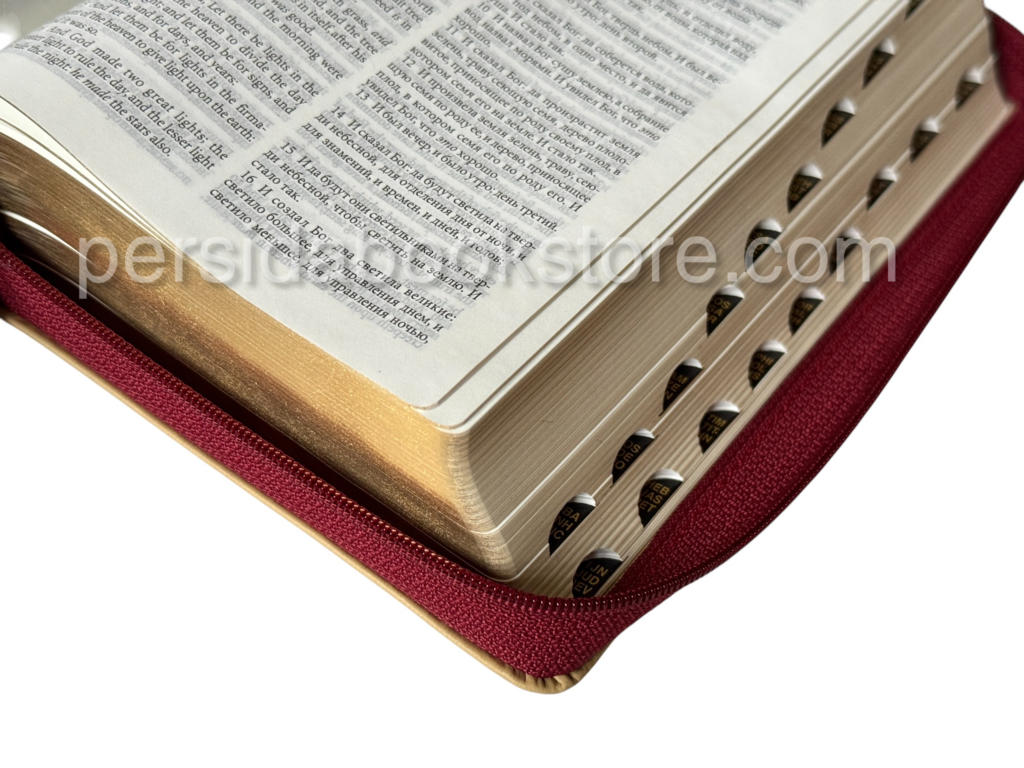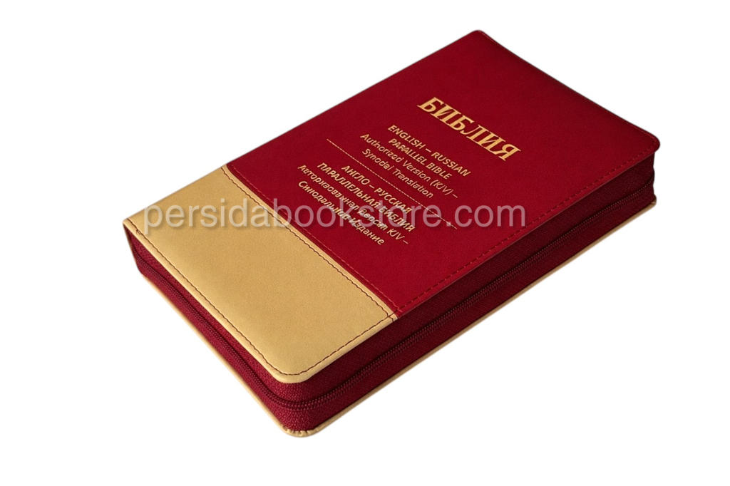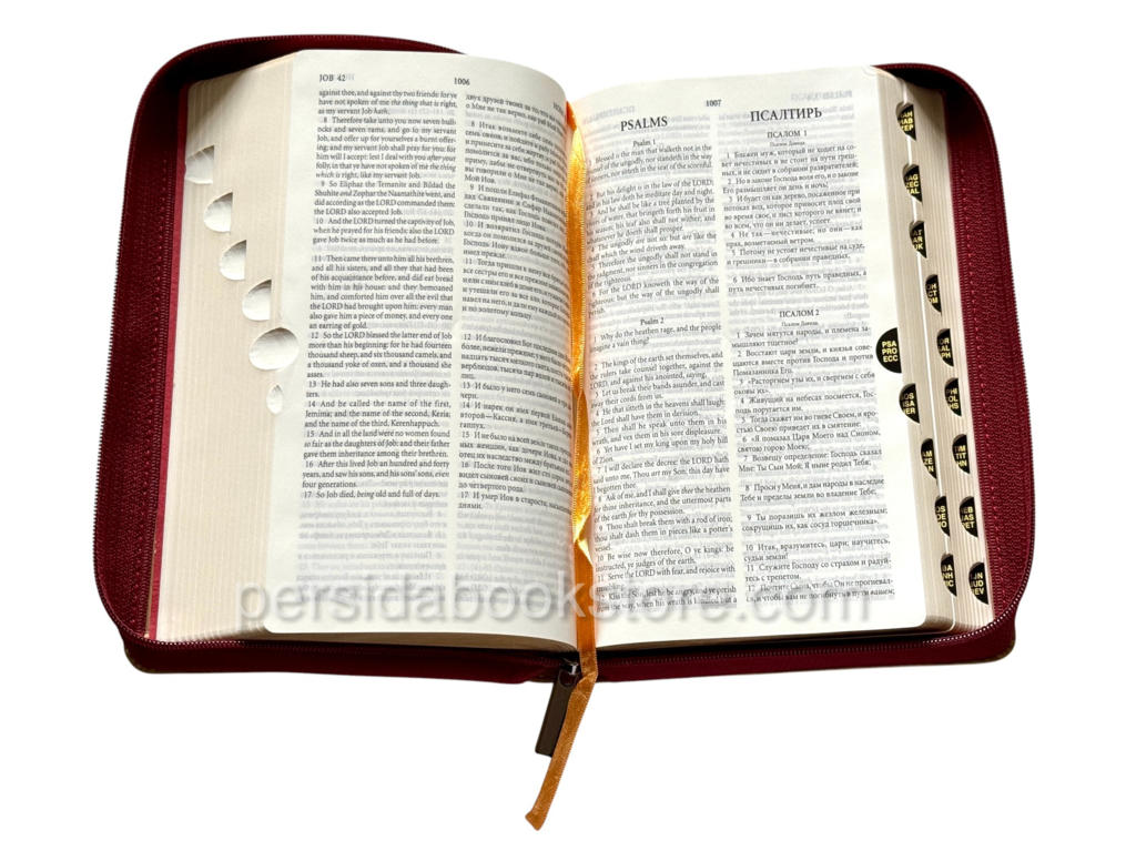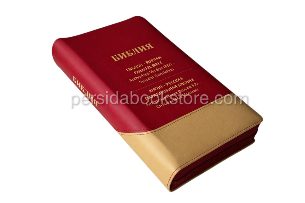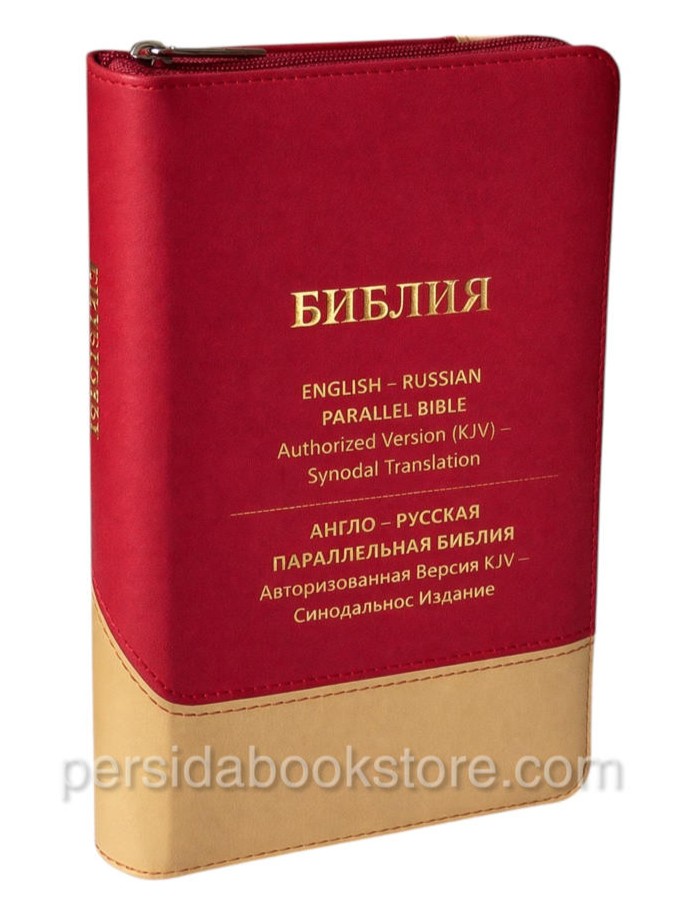 2148 pages, publisher — RBO, Cowhide leather. Gold edge, indexes, no footnotes, zipper, bookmark, size 13X21 sm Or 8.1 / 4 «X 5.1 / 5.8″ English version of KJV, Russian version — Synodal translation.
