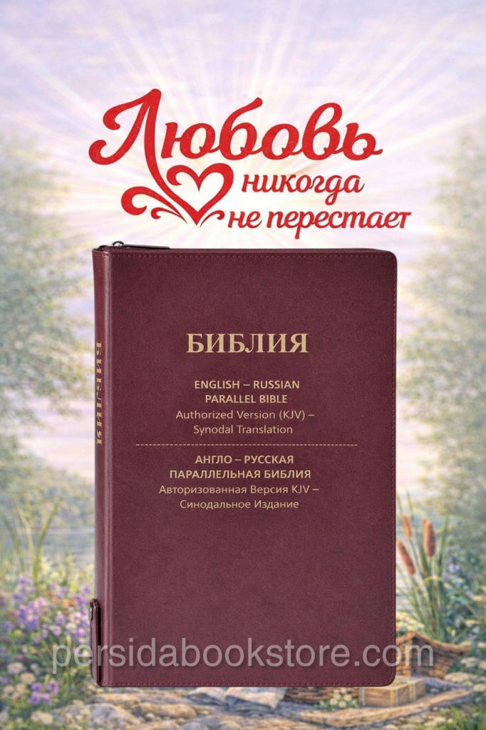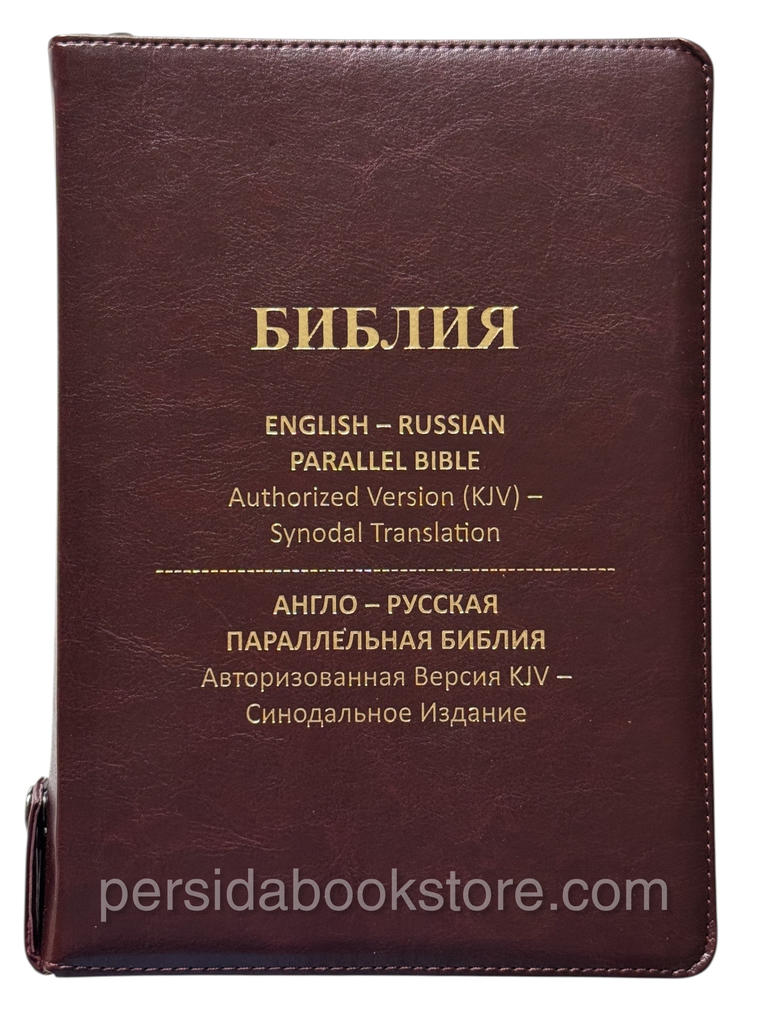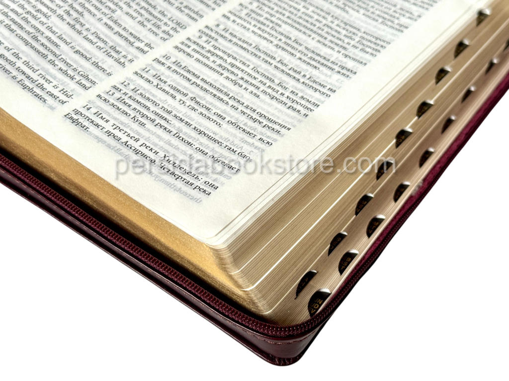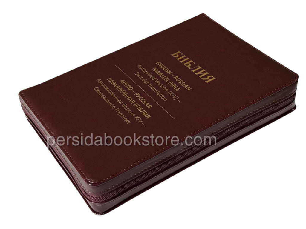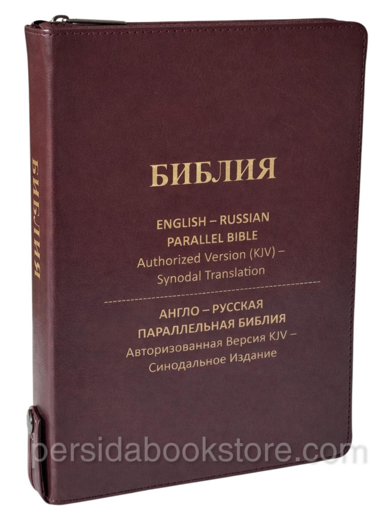2148 pages, publisher — RBO, Burgundy color, gold edge, indexes, no footnotes, button, zipper, bookmark,Large size 18X24 sm Or 7 «X 9 English version of KJV, Russian version — Synodal translation.