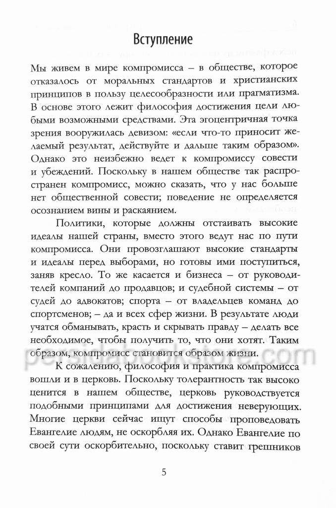 Мы живем в обществе, которое в значительной степени отказалось от моральных норм и христианских принципов. Ложные предвыборные обещания, обманчивая реклама, воровство и коррупция – компромисс стал образом жизни. Такие моральные уступки не чужды даже для церкви. Столкнувшись с возможностью провозгласить Христа неверующим, мы чувствуем себя запуганными и молчим. Или мы смягчаем то, что говорит Слово Божье об этических вопросах на работе или в нашем обществе, чтобы избежать отвержения. Слишком часто мы предпочитаем лицемерие принципиальности. Но Бог жаждет, чтобы Его люди были другими. чтобы мы были верными Его стандартам, какой бы ни была цена. Достижимо ли последовательное послушание Богу – принципиальность – в этом мире греха и эгоизма? По милости и силе Божьей – да!