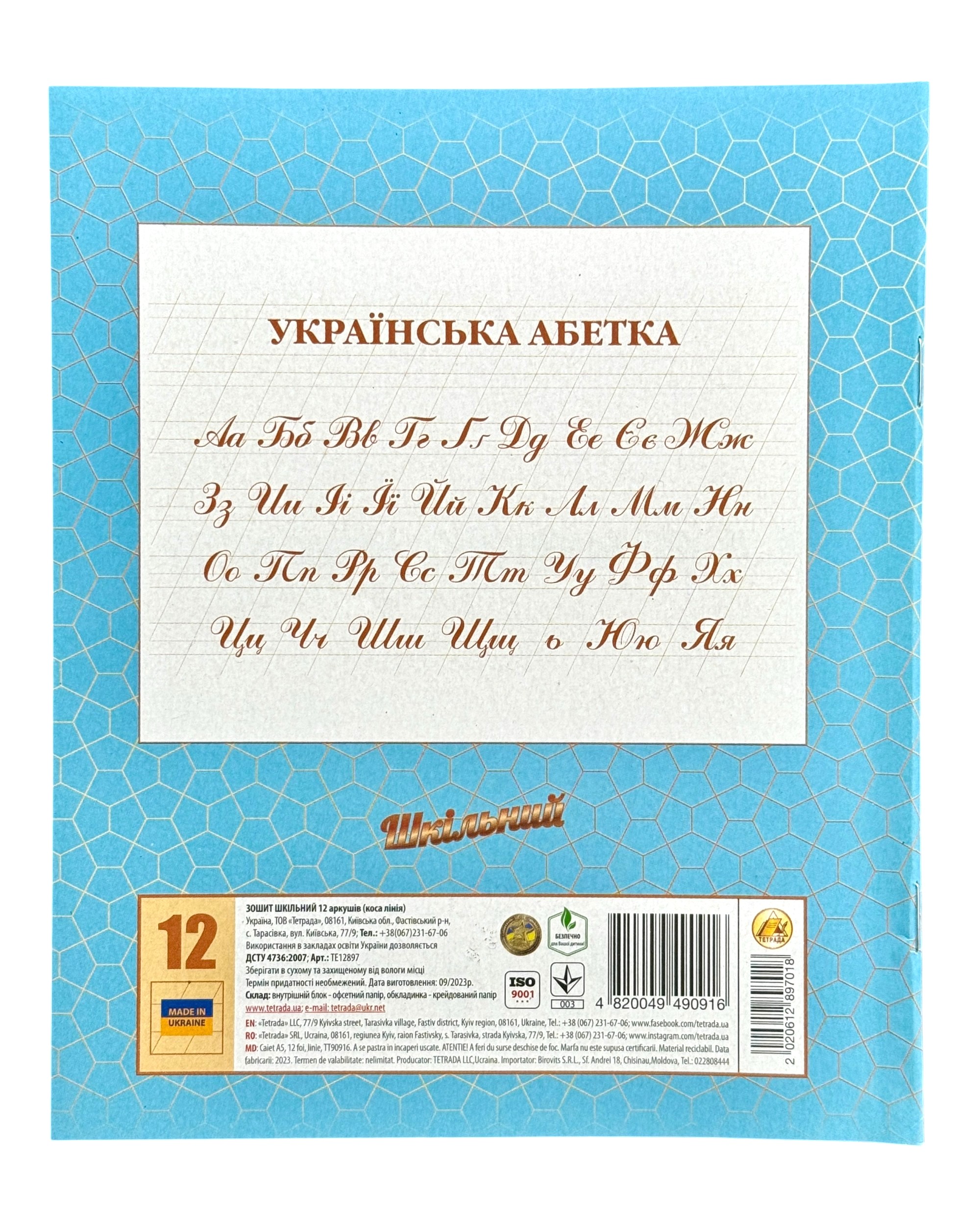 Ученическая тетрадь в «косую» линейку 12 листов, на обратной стороне алфавит украинский, издательство ТОВ Тетрада.