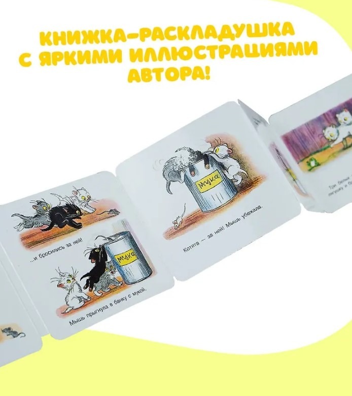 Книжка-игрушка для самых маленьких. Знаменитая история В. Сутеева о трёх неразлучных друзьях в новом формате! Очаровательные котята, чёрный, серый и белый, проведут очень насыщенный день — испачкаются в муке и саже, повстречают лягушку и даже искупаются в пруду! Проследить за перемещениями озорных котят поможет формат книжки-раскладушки. Рисунки автора.