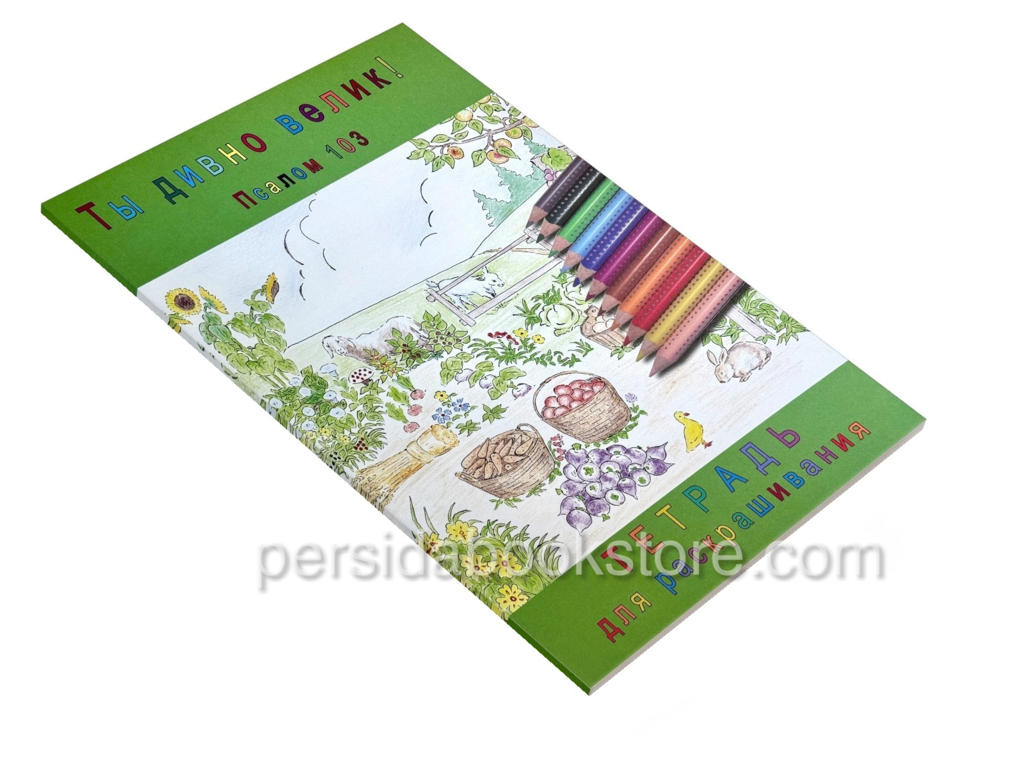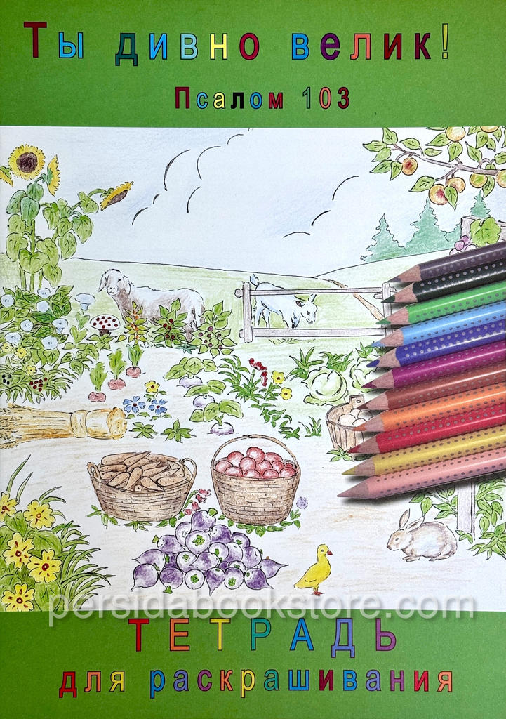 Эта книга для раскрашивания поможет детям с помощью Псалма 103 познать как велик наш Небесный Отец. Каждая страница состоит из напечатанного стиха из этого Псалма и картинки, соответствующей этому стиху, которую детям необходимо раскрасить. На внутренней стороне обложки напечатан Псалом Давида 103.