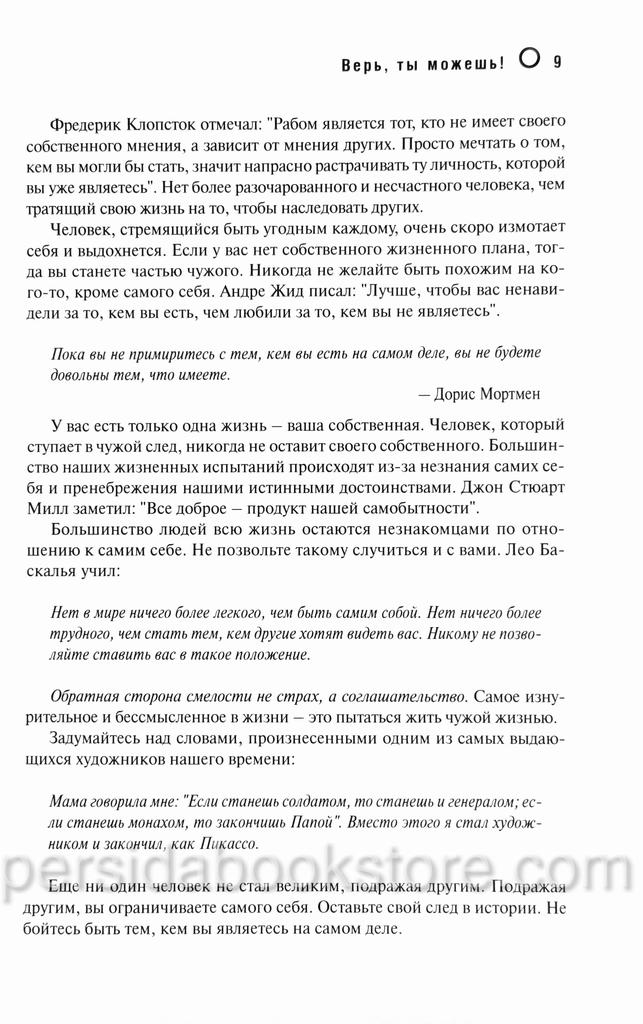 Вы были созданы не таким, как все. Вы были созданы, чтобы жить уникальной и неограниченной жизнью. Вы не можете стать никем другим, и никто другой не сможет стать вами. Так что же вас удерживает от того, чтобы быть тем, кем Бог создал вас? Чьей лжи вы поверили, что вы не сможете, не достигнете или не должны достигать своей мечты?